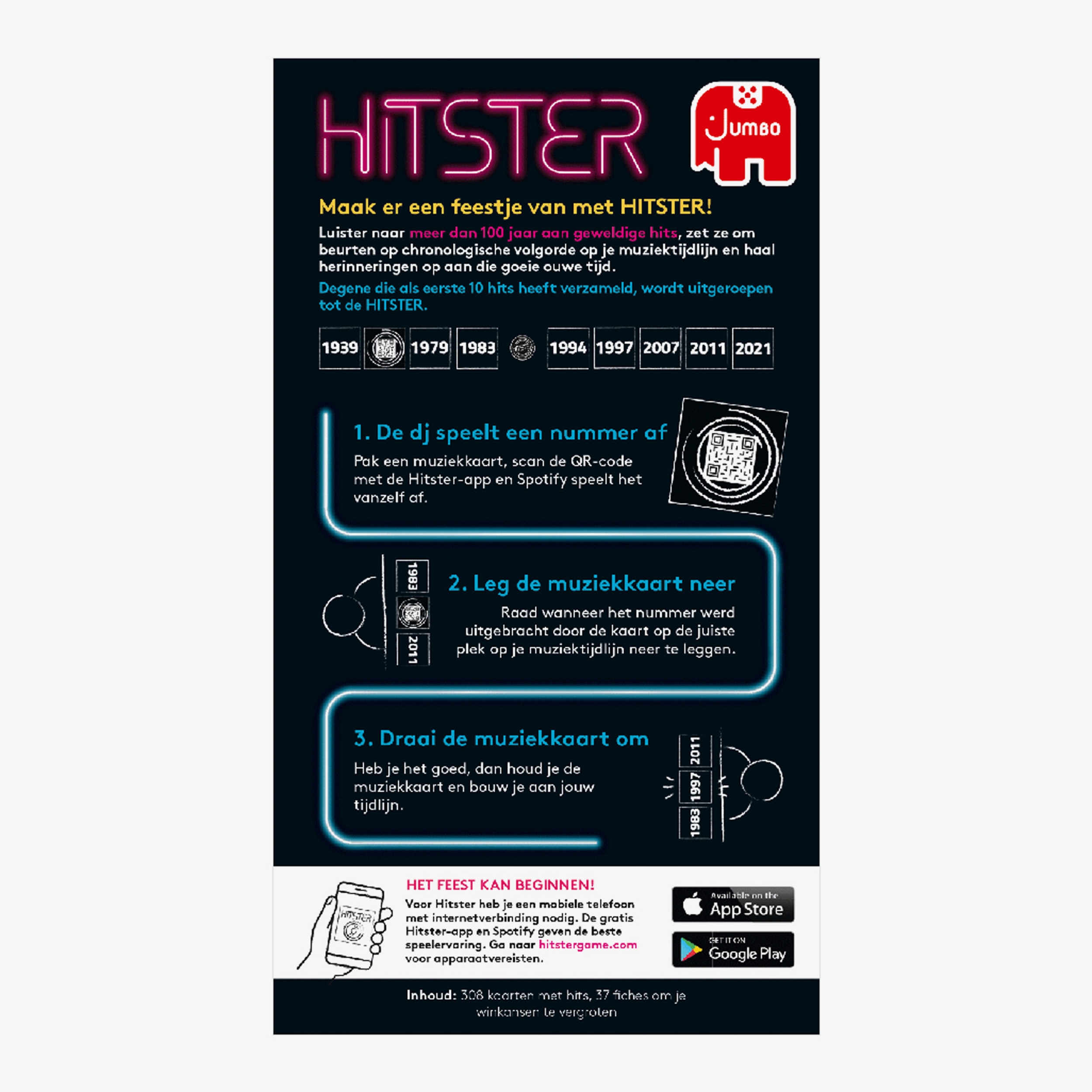 Test je muziekkennis met Hitster! Scan de kaart, raad het nummer, de artiest en leg het kaartje op de tijdlijn. Degene die als eerste 10 nummers in de juiste chronologische volgorde weet te plaatsen wint! Met meer dan 300 van de grootste hits van de afgelopen 100 jaar is Hitster het perfecte spel voor een avondje plezier, lachen, zingen, dansen en het ophalen van herinneringen. Dus nodig je vrienden uit voor een onvergetelijke avond en ontdek wie zichzelf tot Hitster mag kronen! Het spel is geschikt voor volwassenen vanaf 16 jaar en voor 2 tot 10 spelers.