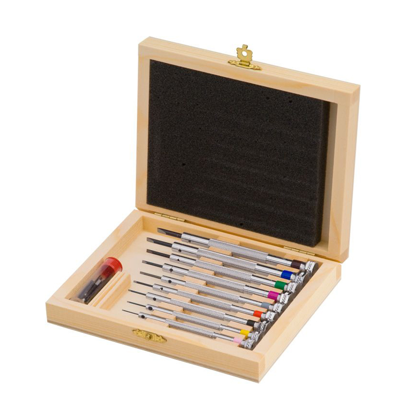 Home » Accessoires » Horloges » Houten kistje met 9 schroevendraaiers 0,6 – 3,0 mm