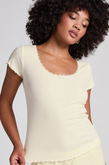 Voel je knus in deze pyjamatop met korte mouwen, ronde hals en kanten details. Ruches aan de mouwen en zoom zorgen voor een speels accent. De zachte, rekbare stof zorgt de hele nacht voor comfort. Korte mouw Ronde hals Kant Strikje