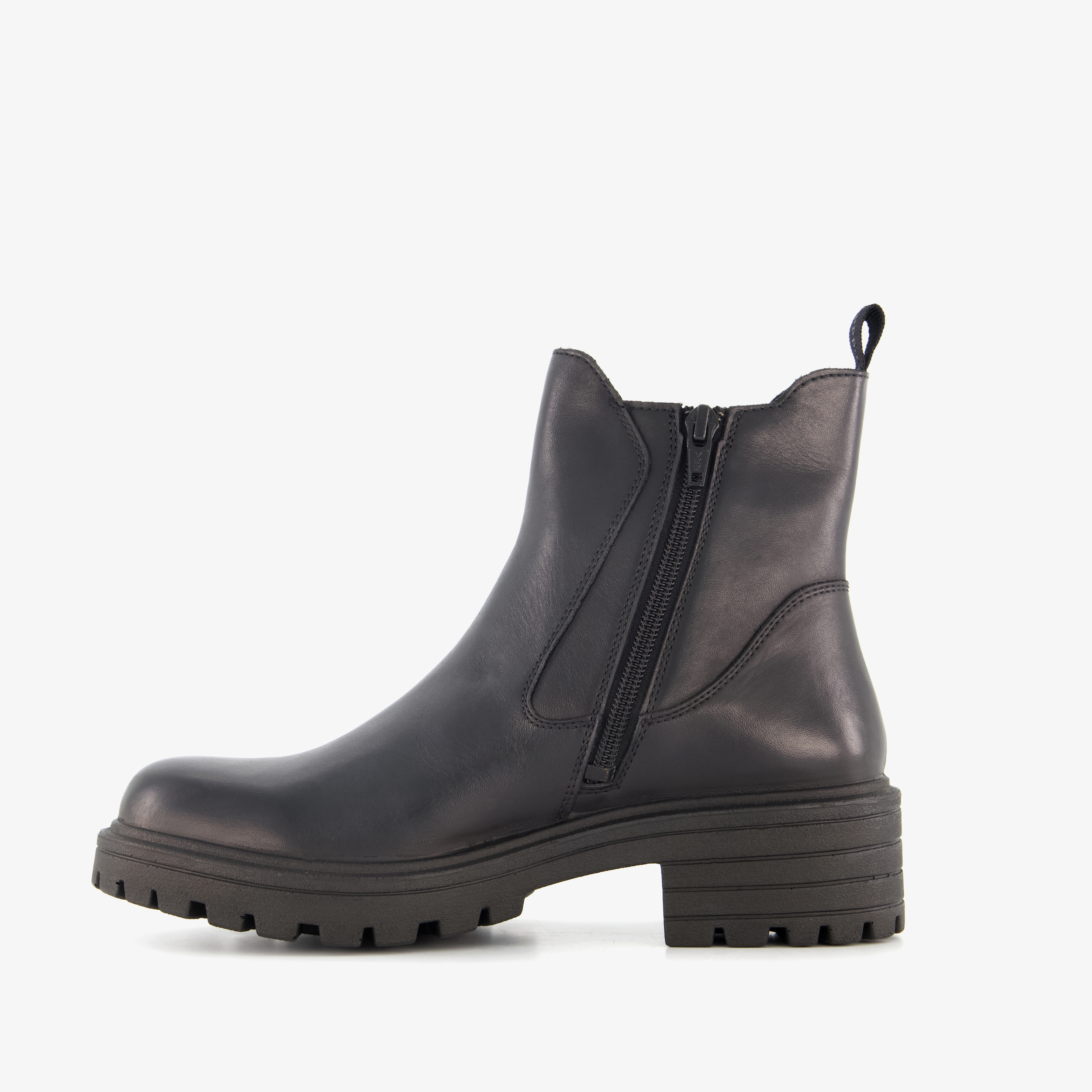 Zwarte Chelsea boots voor dames van Hush Puppies. Het buitenwerk en het binnenwerk zijn van leer en de stevige zool met profiel is van rubber. Voorzien van een ritssluiting aan de binnenkant en een elastische inzet aan de buitenkant. De boots hebben een aantreklusje aan de achterkant en een vaste binnenzool van synthetisch materiaal. Ze hebben een laag hakje en een schachthoogte van 13 cm.
