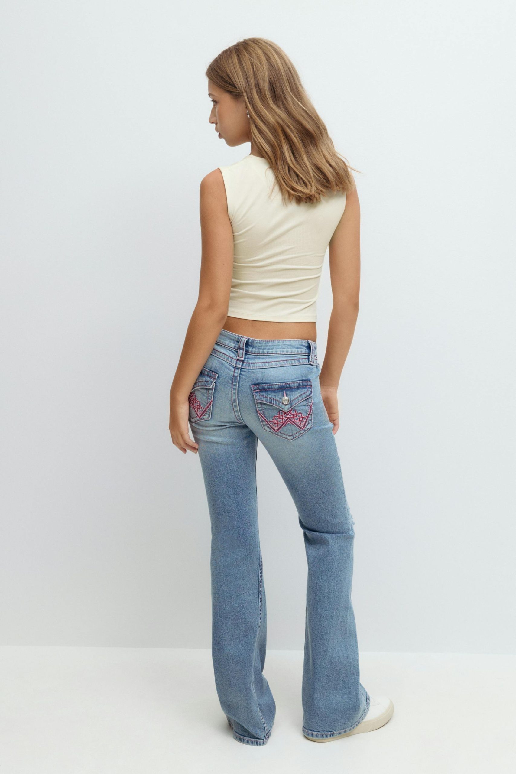 Bootcut jeans met scheuren aan de voorkant. De spijkerbroek is blauw en heeft achterzakken met flap. Het heeft midden taille, gulp, voorzakken, uitlopende pijpen, lage stretch en gedraaide naden.