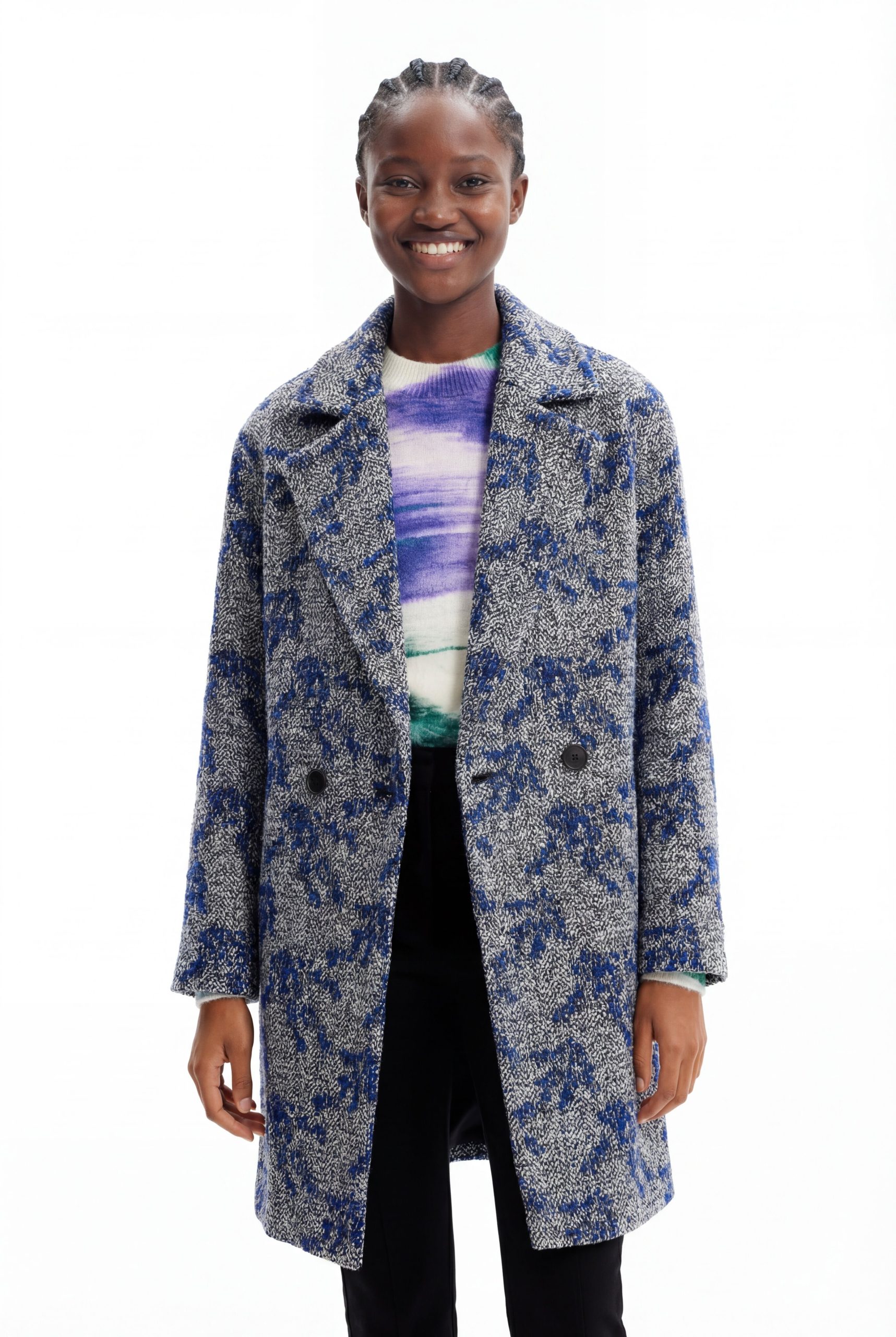Double-breasted jas in jacquard met visgraatmotief en contrasterende details. Klep, zakken en binnenvoering.
