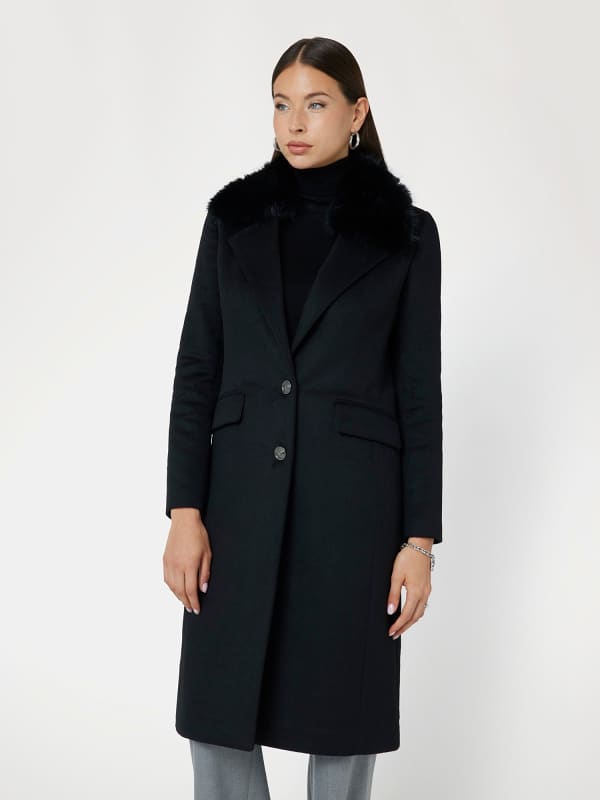 Melton jas van gemengde wol.Ingekeepte revers met afneembaar imitatie bont.Lange mouwen, zakken aan de voorkant.Regular fit.Sluiting met knopen.Het model draagt maat S.Zie onze bovenstaande maattabel.Totale lengte: 106 cm / 41,7 inch.Mouwlengte: 63 cm / 24,8 inch.Valt normaal op maat.