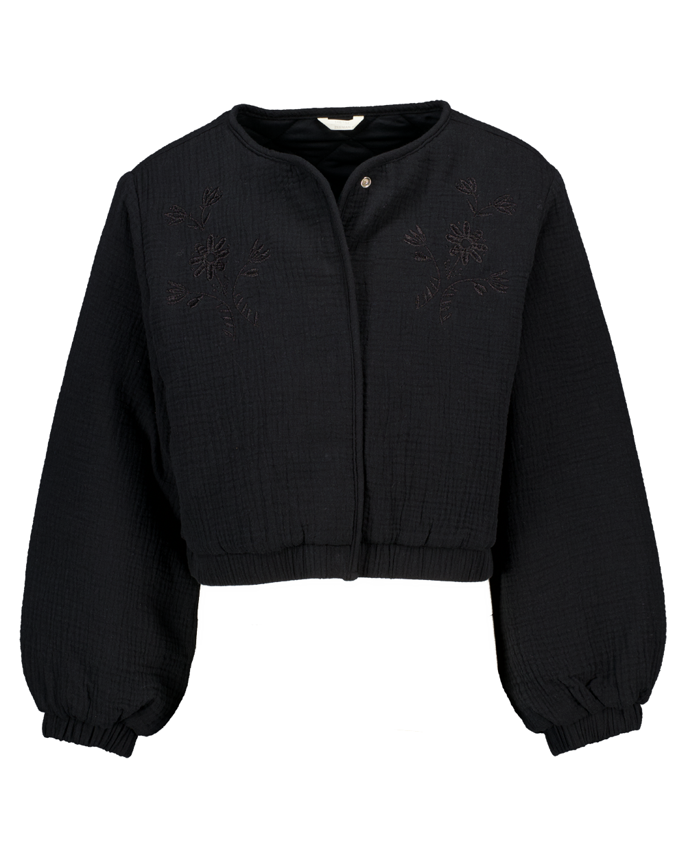 Deze zwarte jas voor meisjes heeft een ronde hals en sluit met drukknopen. De lichte stof in combinatie met de subtiele geborduurde details aan de voorkant geeft de jas een speelse uitstraling. De lange mouwen met elastiek zorgen dat de jas goed blijft zitten. Door de kleur is het goed te combineren met andere kledingstukken