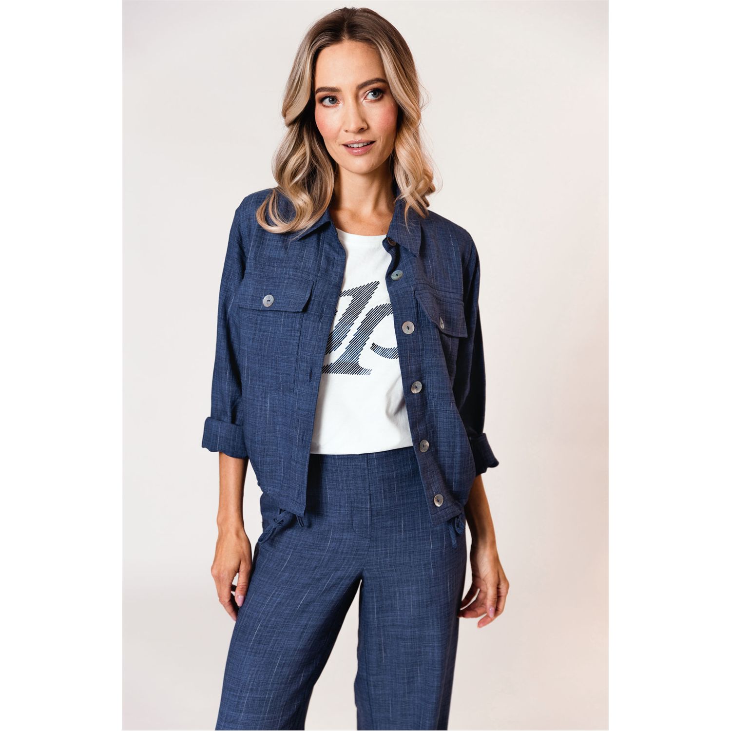 Dit blouse jasje is gemaakt van een gemêleerde blauwe stof die soepel valt. voorzien van overhemdkraag, klepzakken en parelmoerknopen. De blouse heeft een cropped lengte en kan worden aangesnoerd voor een bloezend effect.