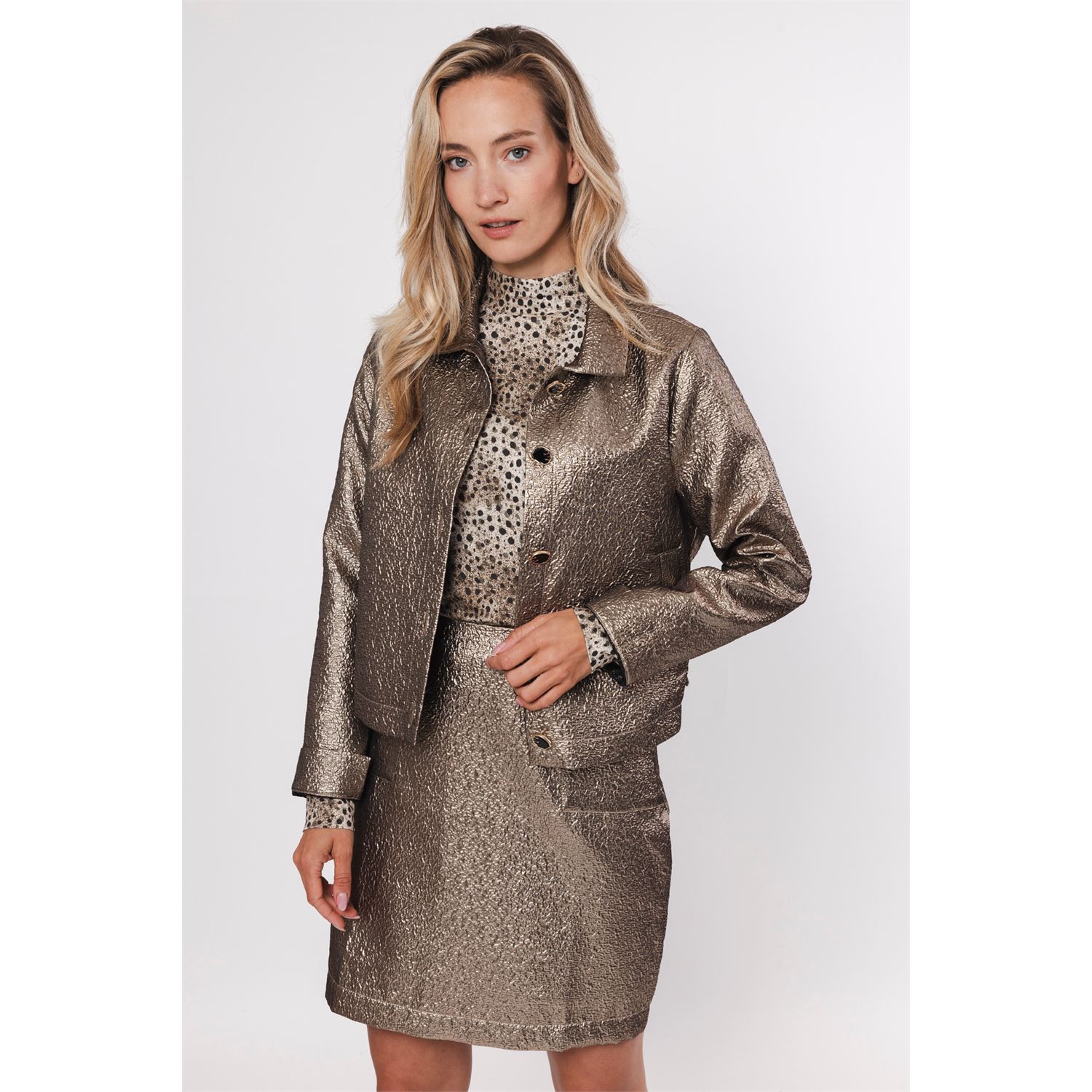 De gestructureerde gouden stof van dit jasje maakt het een echte eyecatcher. Voorzien van overhemd kraag, steekzakjes en prachtige knopen. Kan zowel casual als feestlijk gestyled worden.