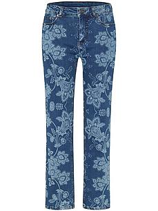 Jeans van PETER HAHN. In een slim fit-vorm met een zadelgedeelte en klinknagels. In klassiek 5-pocketmodel met gevormde tailleband met riemlussen en gestikte zoom. Sluit met knoop en ritssluiting. Het paisleypatroon zorgt voor een luxe uitstraling. Dit it-piece mag in geen enkele garderobe ontbreken Zonder riem. 98% katoen (22% katoen (gerecycled)), 2% elastaan. Binnenbeenlengte in normale maat ca. 72 cm, in korte maat ca. 68 cm. Voetbreedte ca. 40 cm. Deze jeans is wasbaar in de machine. wasbaar tot 30°. chloorbleken niet mogelijk. koud strijken. chemische reiniging. drogen met lage temperatuur. 23, 24