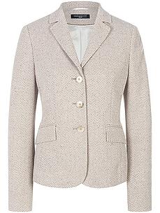 Jersey blazer van FADENMEISTER BERLIN in tijdloze luxueuze look. Voortreffelijke visgraatjersey in chique natureltinten staat voor puur understatement. De perfecte verwerking met reverskraag, 3-knoopsluiting en 2 gepaspelde klepzakken kenmerkt de hoogwaardige FADENMEISTER BERLIN-stijl. 50% polyester, 30% katoen, 16% viscose, 4% zijde. Ook binnenin perfect verwerkt met AMF-stiksels, gepaspelde randen en elastische voering van 67% acetaat, 33% polyester. Lengte ca. 58 cm. Chemische reiniging. niet wasbaar. chloorbleken niet mogelijk. koud strijken. chemische reiniging. drogen in de droger niet mogelijk. 36, 38, 40, 42, 44, 46, 48