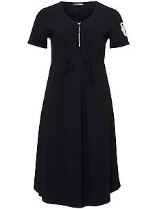 Jersey jurk van DORIS STREICH met korte mouwen. Casual en clean, van techno-stretch met crêpeachtige touch voor het hoogste draag- en bewegingscomfort. Elegante, iets uitlopende stijl met decoratieve rits aan de contrastkleurige ritssluiting, rijgkoord met bandjes voor en een afgeronde zoom. Linkermouw met printdetail. 75% polyamide, 25% elastan. Lengte in maat 42 ca. 125 cm. Machinewasbaar. fijnwas tot 40°. chloorbleken niet mogelijk. koud strijken. chemische reiniging. drogen in de droger niet mogelijk. 40