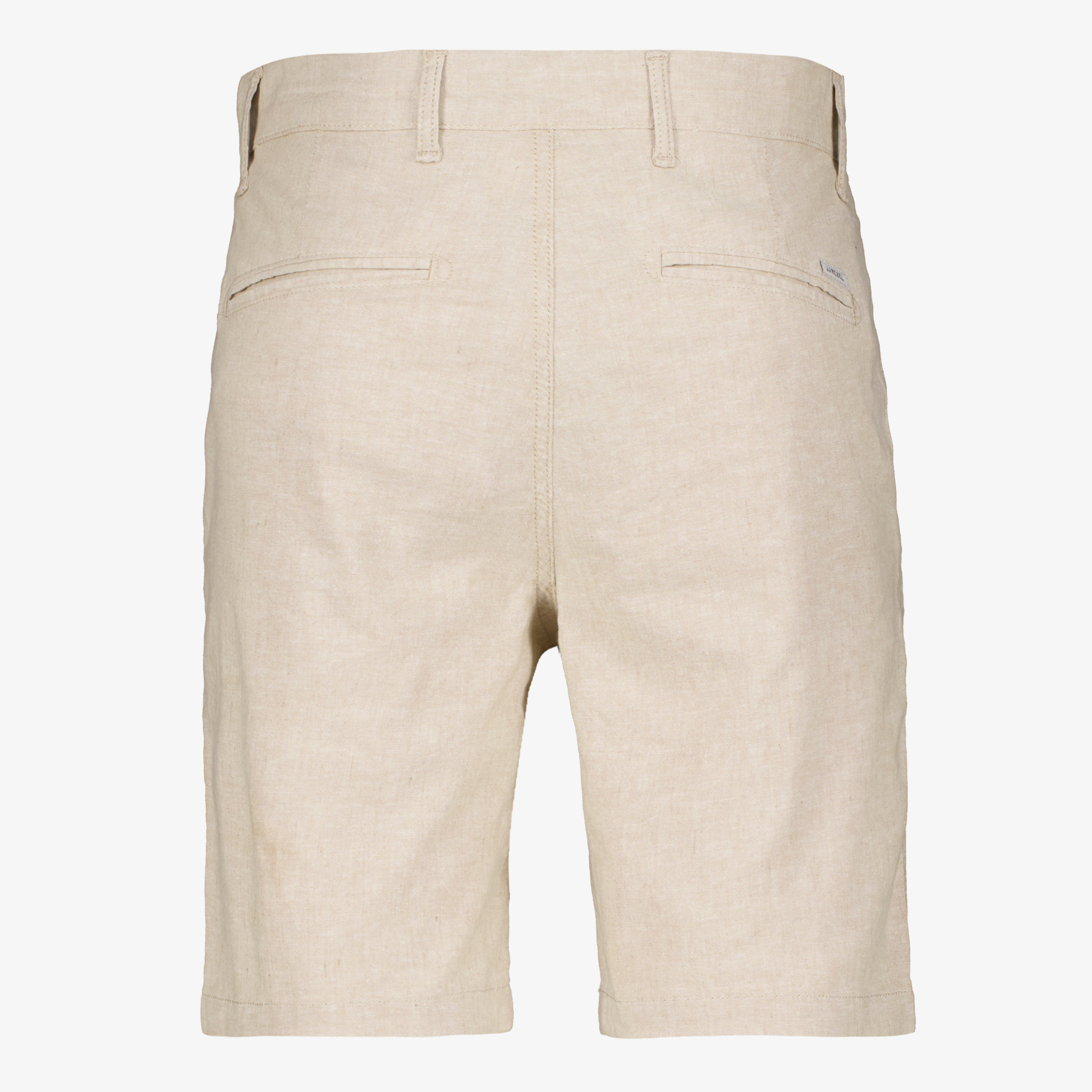 Beige chino heren short van JJ REBEL. Voorzien van een knoop- en ritssluiting, riemlusjes in de boord en twee voor- en achterzakken. De korte broek is gemaakt van 81% katoen, 15% linnen en 14% elastaan. Dit maakt de short luchtig en dus ideaal om te dragen in de zomer.