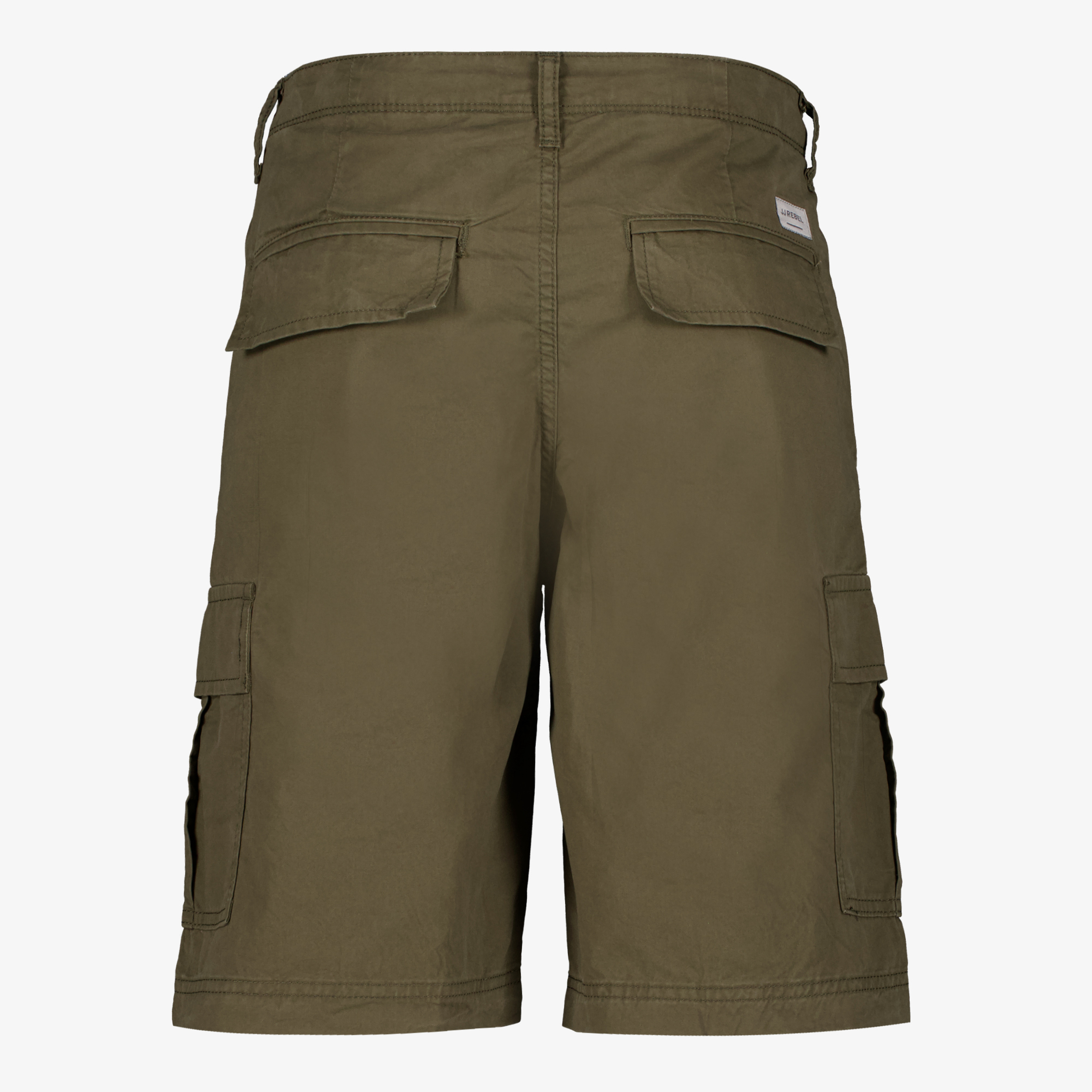 Groene heren cargo short van JJ REBEL. Voorzien van een knoop- en ritssluiting, riemlusjes in de boord en twee voor- en achterzakken. De korte broek heeft twee grote zakken met klepje sop de bovenbenen en is gemaakt 100% katoen.