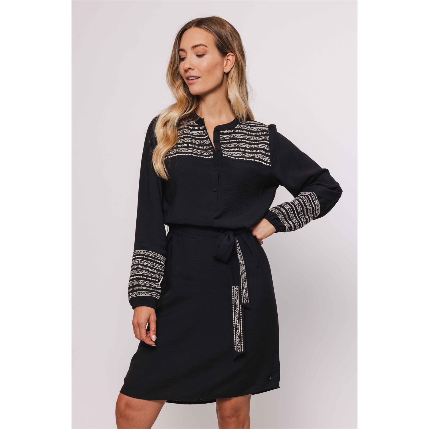 Deze jurk is door de borduur details een echte eye-catcher. De jurk heeft een opstaand kraagje met knoopsluiting tot halverwege de jurk. De jurk kan zowel met als zonder ceintuur gedragen worden.