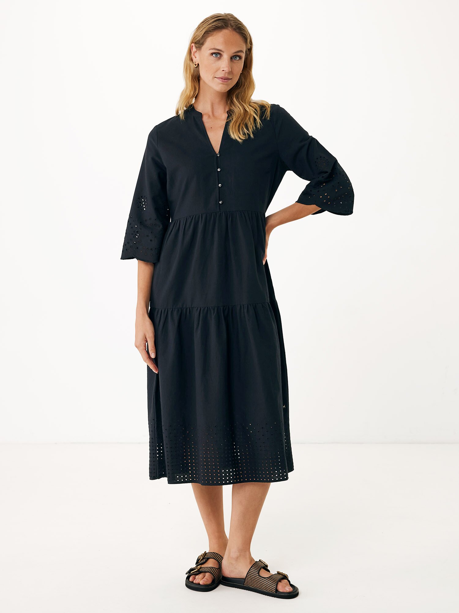 Ervaar ultiem comfort met deze zwarte jurk van katoen en linnen. De broderie anglaise details geven een unieke touch aan een klassieke look. De zachte A-lijn snit biedt een vloeiende pasvorm, terwijl de geometrische print het stuk modern maakt. Combineer met een paar sandalen voor een casual uitstraling of kies voor hakken voor een chique avond. Bekijk de volledige collectie opMexx Dames Kledingvoor meer stijlen.