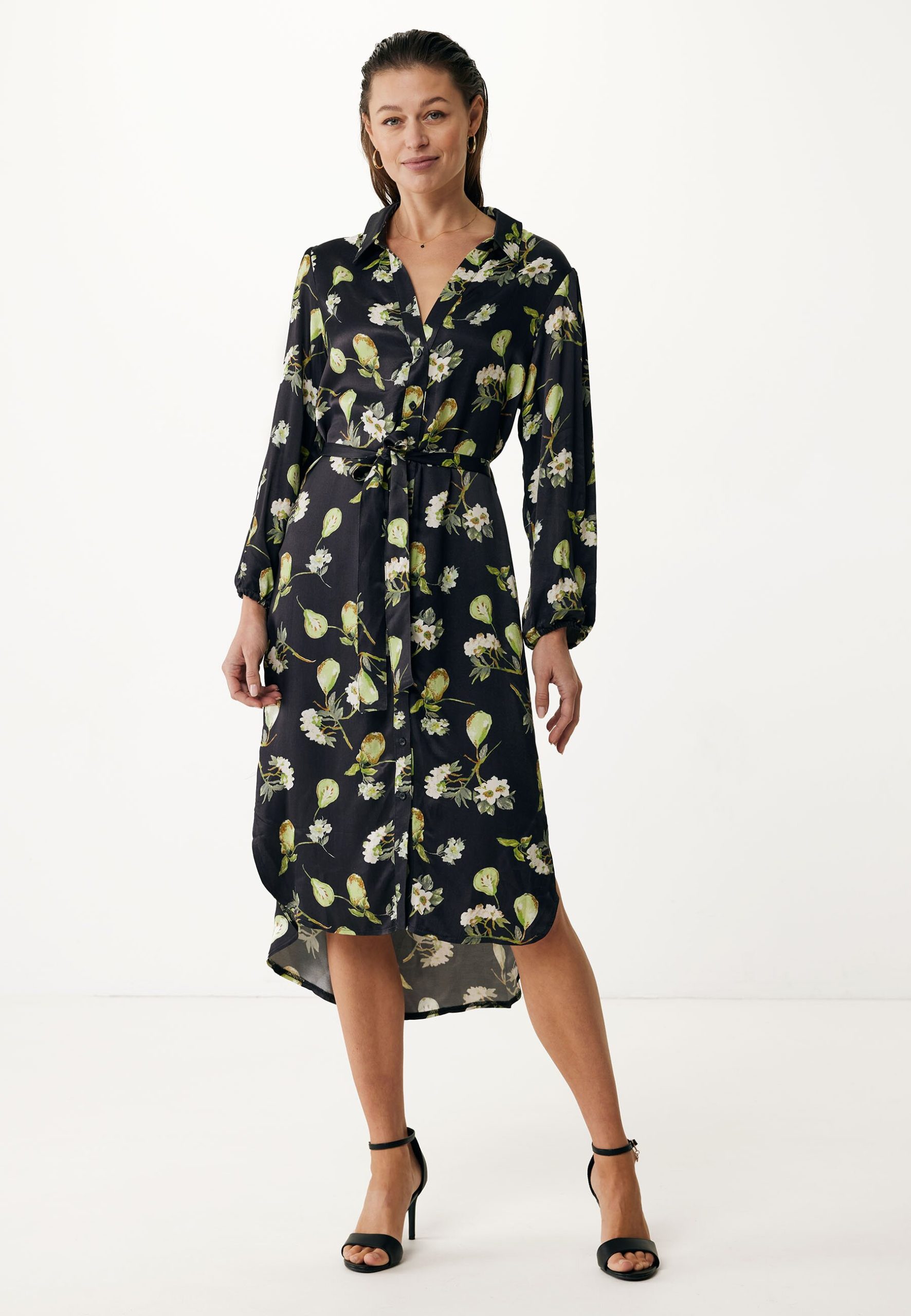 Deze elegante zwarte jurk met bloemenprint combineert stijl met comfort. Gemaakt van zachte viscose, voelt hij aangenaam op de huid. De jurk heeft een subtiele knoopsluiting aan de voorkant en een bijpassend ceintuur voor een vrouwelijke pasvorm. Met zijn lange mouwen en vloeiende snit is hij perfect voor verschillende gelegenheden. Combineer deze jurk met een paar enkellaarsjes voor een casual dagelijkse look of draag hem met hakken voor een meer geklede uitstraling. Bezoekdameskleding bij Mexxvoor meer inspiratie.