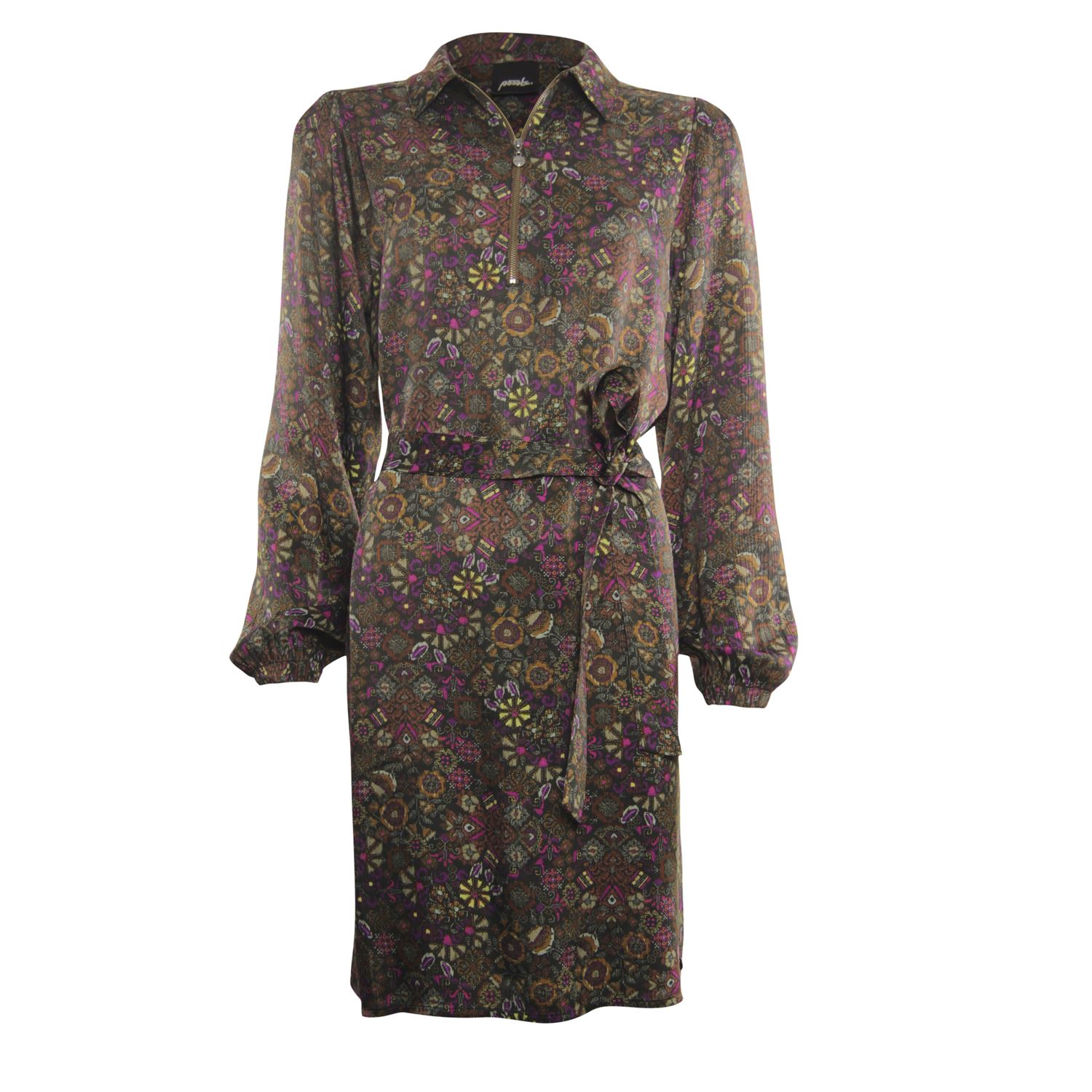 Crinkle satijn is de stof van deze jurk. De print is vrolijk met felle kleur accenten. Deze jurk kan zowel met als zonder ceintuur gedragen worden. De kraag flatteert de hals.