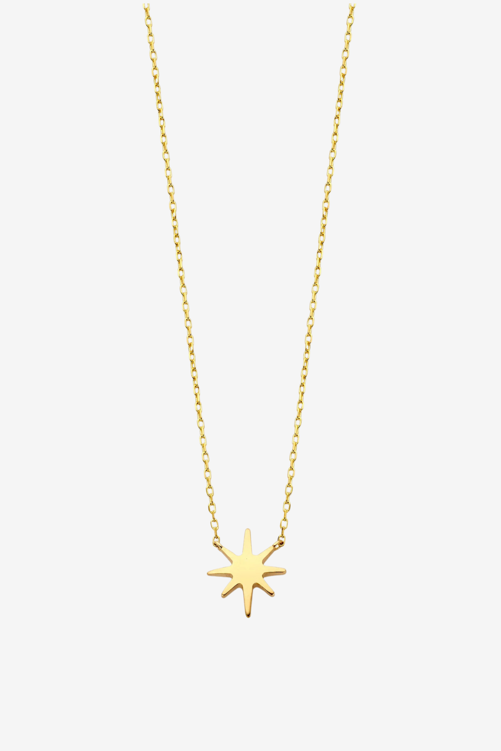 Hier zie je de ketting Universe Star geelgoud van Just Franky. De sterhanger heeft acht ongelijke punten en een glanzende afwerking die mooi oplicht op de huid. De fijne schakelketting houdt de hanger centraal, waardoor de vorm duidelijk zichtbaar blijft. Het 14 karaat geel goud voelt licht en glad aan en draagt heel natuurlijk. Elke ketting wordt met de hand gemaakt, zoals je van dit Nederlandse merk mag verwachten. Just Franky staat bekend om strak design en zorgvuldig vakmanschap, en dat zie je hier goed terug.
