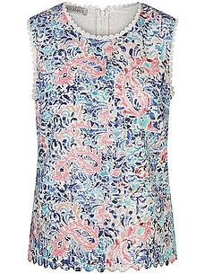Kanten top van UTA RAASCH. Iets getailleerd model met ronde hals en voering. De fijne ritssluiting middenachter maakt het aan- en uittrekken gemakkelijk. De mouwen en halslijn zijn versierd met een golvende kanten rand. De afgeronde zoom heeft een geschulpte rand. De print op het kant maakt elk exemplaar uniek en zorgt voor een levendige, frisse uitstraling. Of je hem nu combineert met een nette broek voor een speciale gelegenheid of met een casual jeans voor een ontspannen dag, deze top kan op vele manieren worden gestyled. 100% polyester. Voering 100% viscose. Lengte ca. 58 cm. Deze kanten top is wasbaar in de machine. fijnwas tot 30°. chloorbleken niet mogelijk. koud strijken. chemische reiniging, veilig. drogen in de droger niet mogelijk. 36, 38, 40, 42, 44, 46, 48