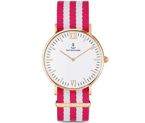 Merk Kapten en Son Materiaal Stainless Steel 316L Serie Campina Horlogekast 40 mm Dikte 7 mm Waterdichtheid 5 ATM Kleur band Rood en wit Band Nylon Breedte band 18 mm Glas Mineral crystal Beweging Ronda 762 Voor Dames EAN 4251145211073