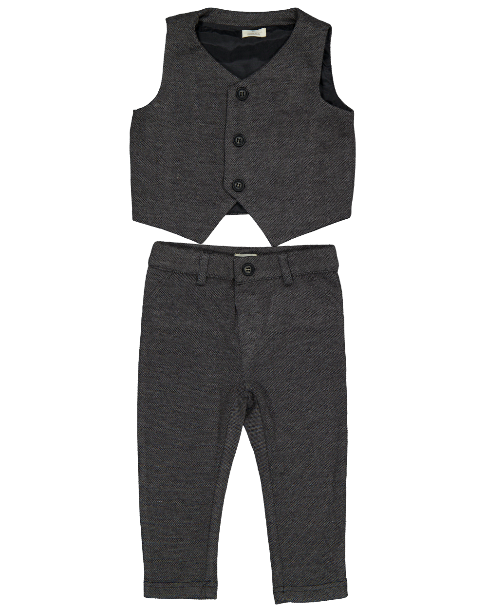 Deze grijze set bestaat uit een mouwloos vest en een lange broek voor baby's. Het vest sluit met drie knopen en biedt veel bewegingsvrijheid. De broek heeft een elastische tailleband, waardoor aan- en uittrekken makkelijk is. Praktisch voor dagelijks gebruik en geschikt voor feestelijke momenten of als nette outfit voor je baby.