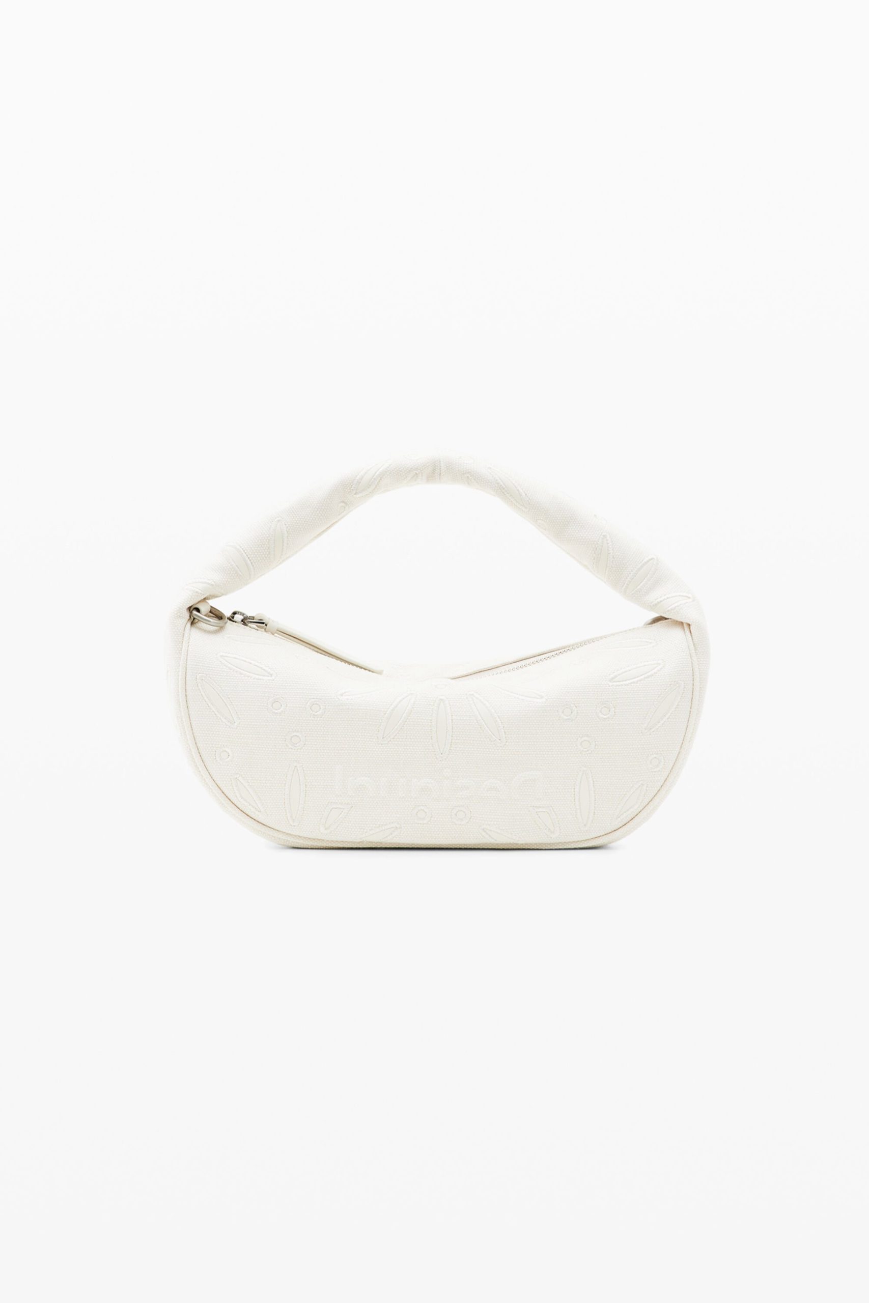 Kleine canvas tas met broderie anglaise en diverse hengsels en vakken.