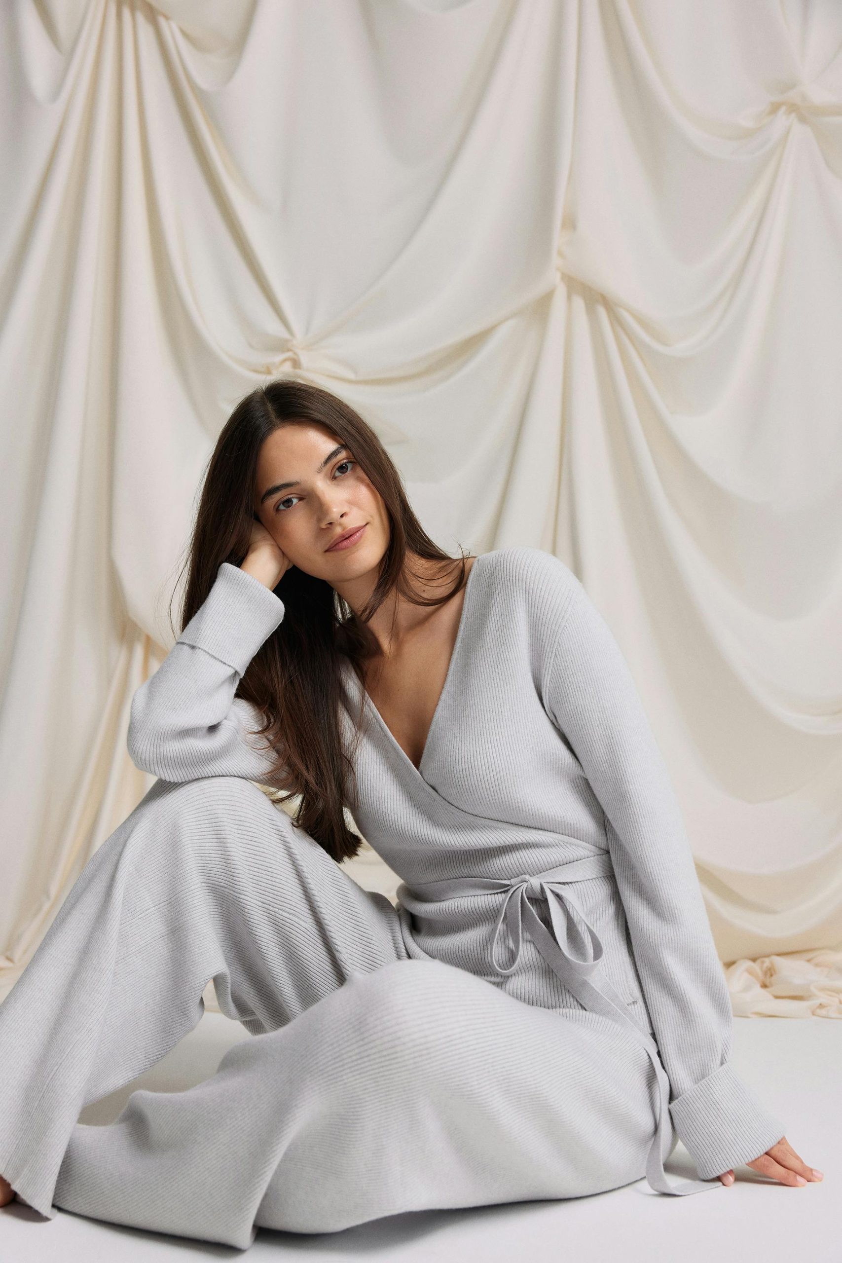 Wikkelvest met een v-cut. Het vest is grijs en heeft lange mouwen. Het heeft een zelfbinder aan de taille en een normale pasvorm.