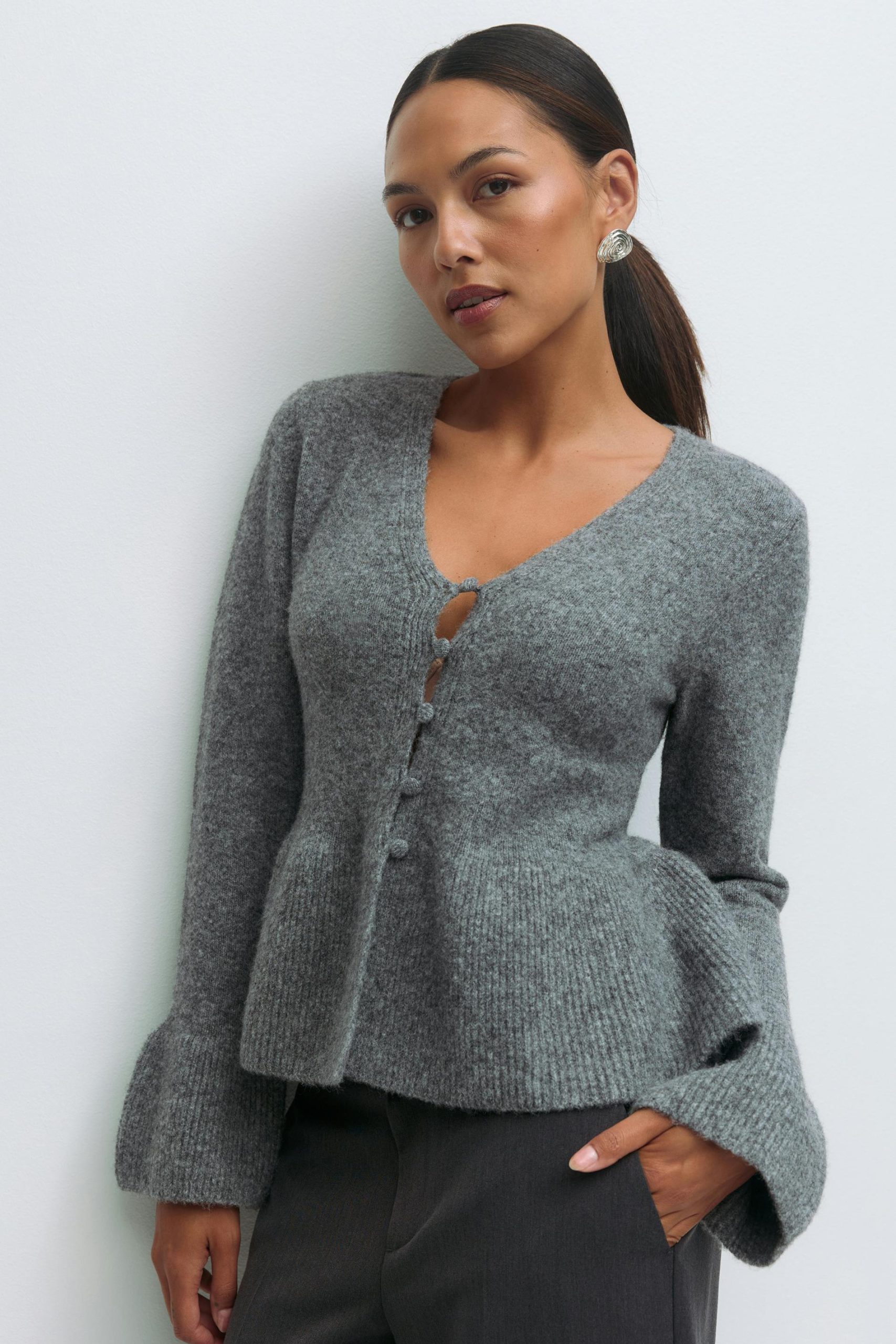 Gebreide sweater met peplum-ontwerp. De sweater is grijs en heeft dichtknoop aan de voorkant. Het heeft v-hals, ruche aan de onderkant en aan de uiteinden van de mouwen en een normale pasvorm.