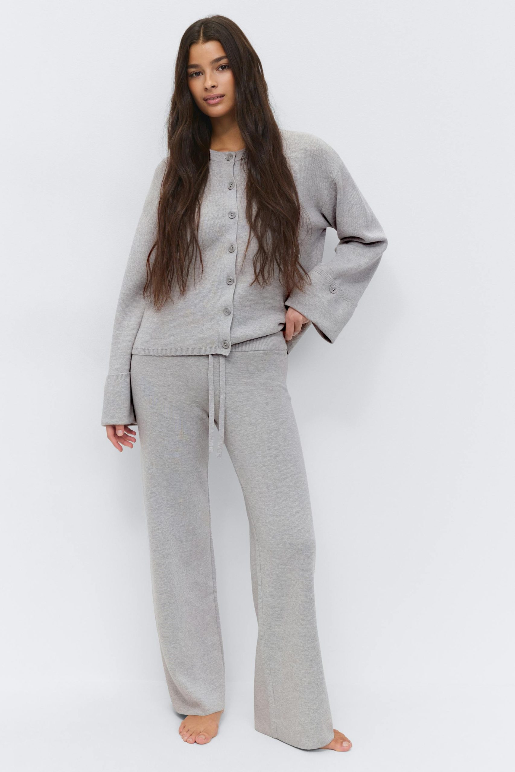 Gebreide broeken met zelfbinder aan de voorkant. De broeken zijn grijs en hebben elastiek aan de taille. Het heeft zak details op het achterpand, rechte pijpen en normale taille.