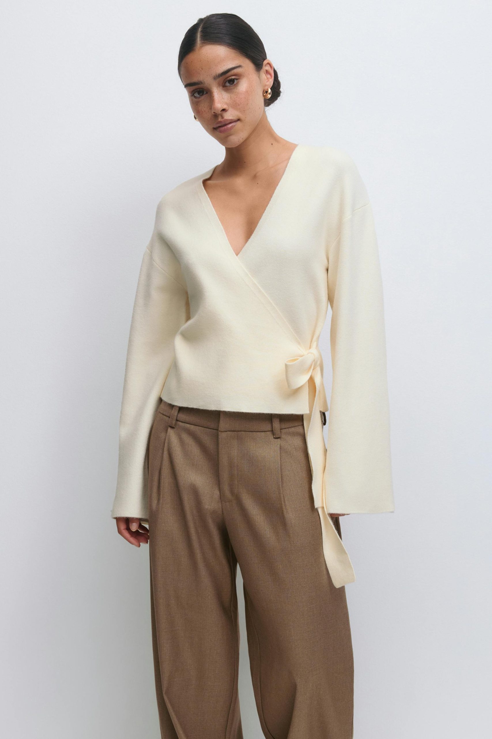 Wikkelvest met v-necksnit. Het vest is gebroken wit en heeft een zelfbinder aan de taille. Het heeft een lange mouw en een normale pasvorm.