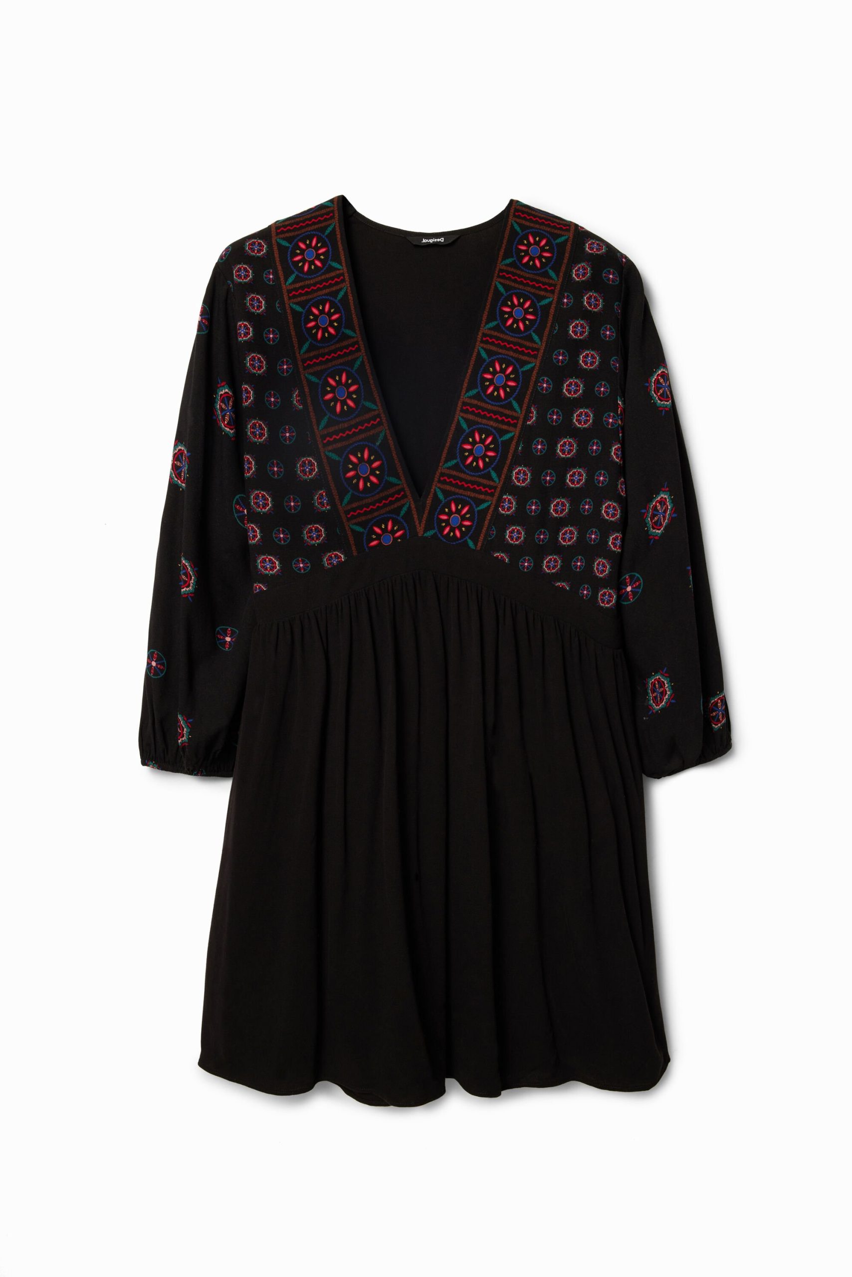 Losvallende korte jurk met driekwartmouwen, V-hals en uitsnijding onder de borst. Etnische opdruk op de voorkant en de mouwen.