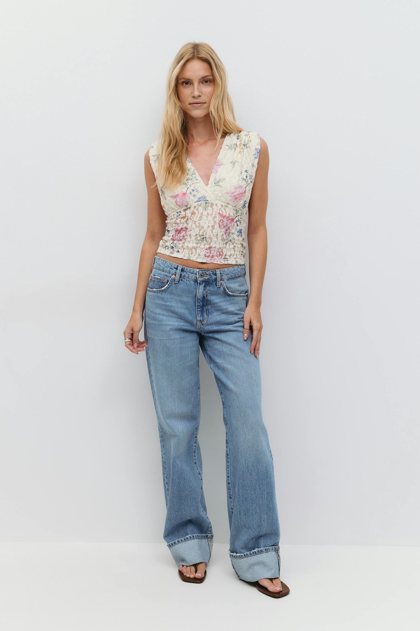 Bloemig kanten topje met v-hals. Het topje is kort en heeft ruches. Het heeft ontwerp zonder mouwen, een normale pasvorm, gevoerde cup, een diep rugdecolleté en brede schouderriemen.