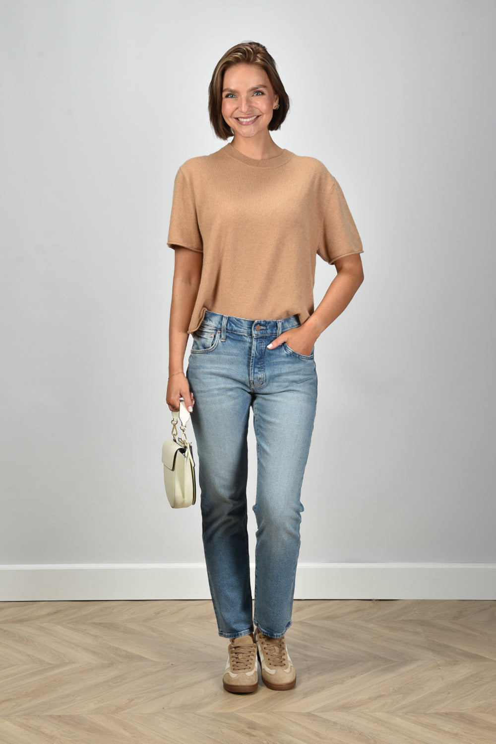 De trui Joya van L’Ame de Julie is zo’n stuk dat meteen rust uitstraalt. Gemaakt van 100% cashmere, met korte mouwen en een rechte, losse pasvorm. De hoge ronde hals sluit mooi aan en laat het silhouet rustig tot zijn recht komen. De camel tint, door de fabrikant semolina genoemd, geeft het item een warme, zachte uitstraling die bij elke huidtoon past. Ideaal om op een lichte jeans te dragen of met een nette pantalon voor een ingetogen look met een subtiel karakter. Combineer de trui Joya camel gerust met de Hogan sneakers Cool HXW6470FB6TTQ70MB6 beige voor een zorgeloze, stijlvolle set. Elk item van L’Ame de Julie wordt ontworpen met oog voor eenvoud en kwaliteit, zodat je kledingstuk jarenlang mooi blijft.