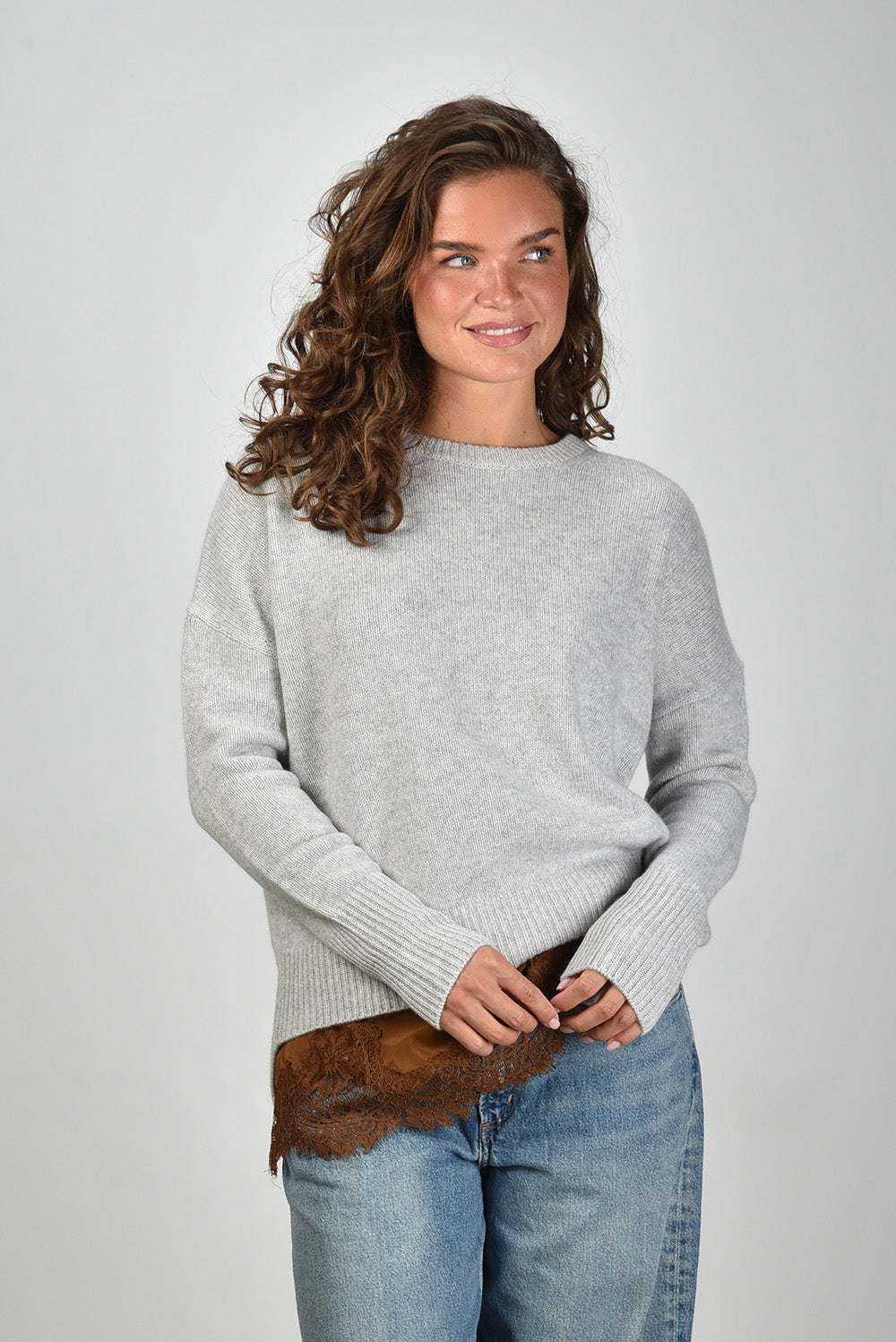 De trui Julia van L’Ame de Julie is een klassieker die meteen rust uitstraalt. Gemaakt van 100% cashmere in een zachte grijstint, ook wel foggy genoemd. De stof voelt vol en soepel, ideaal voor dagen waarop je iets bijzonders wilt dragen zonder dat het te veel vraagt. De ronde hals en brede ribboorden geven het model een verzorgde afwerking. Net onder de zoom komt een randje bruin kant tevoorschijn, subtiel en opvallend tegelijk. Deze trui valt normaal op maat, dus je kunt je eigen maat kiezen. Draag de Julia bijvoorbeeld op de Agolde jeans Keira voor een ontspannen maar stijlvolle combinatie. L’Ame de Julie staat bekend om pure materialen en ontwerpen die jaren meegaan. De Julia past daar precies bij: eenvoudig, met aandacht gemaakt en met een luxe uitstraling die vanzelf spreekt.