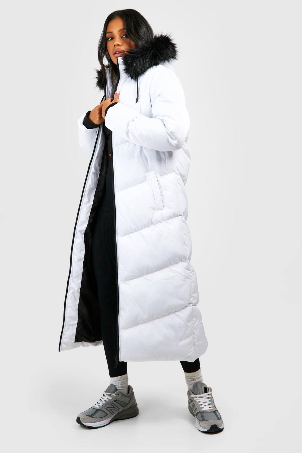 Lang Model Pufferjas Met Namaakbontafwerking, White