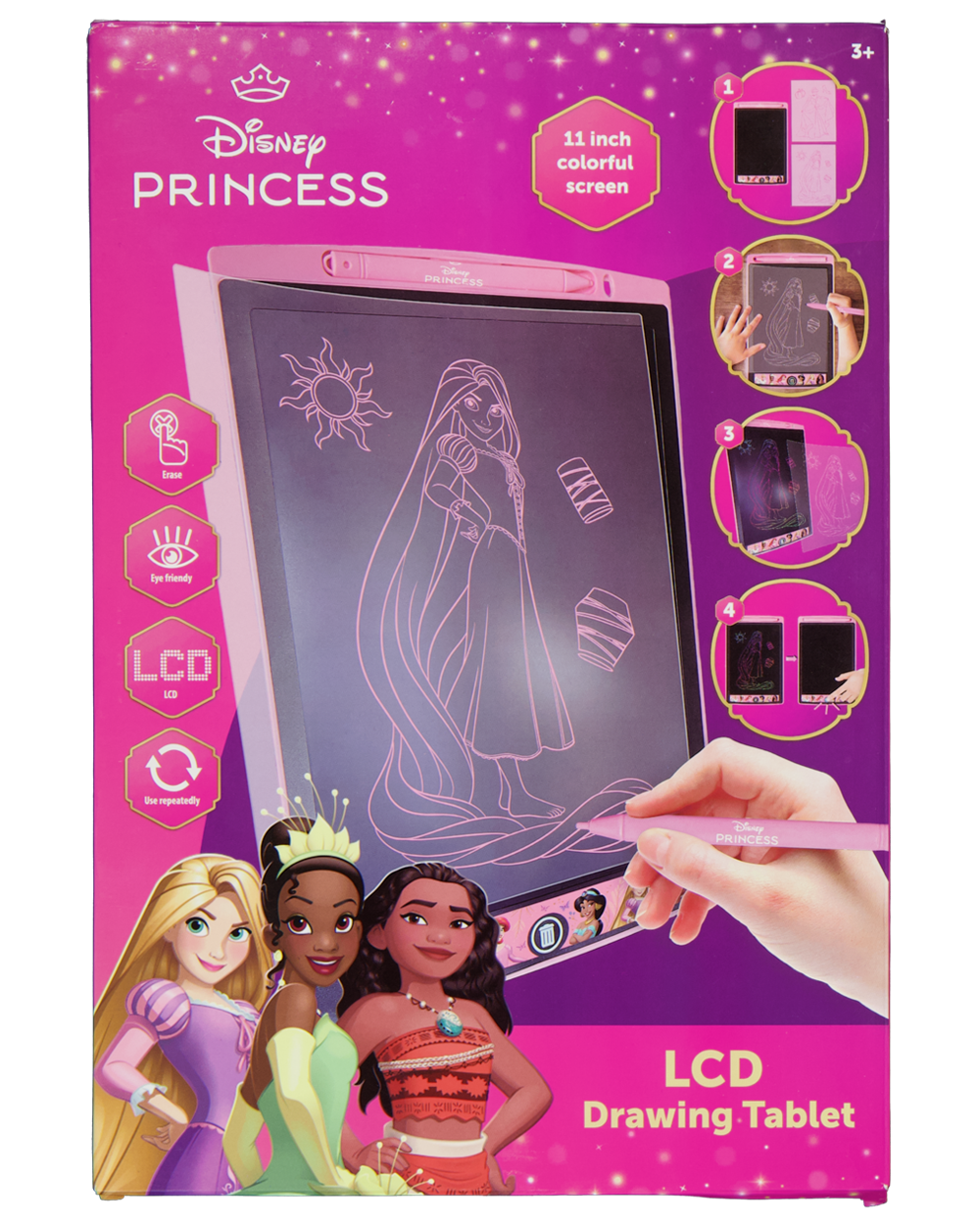 Deze LCD tekentablet heeft een groot, kleurrijk 11 inch scherm. Je kunt er eenvoudig op tekenen en met één druk op de knop wissen. Door het lichte ontwerp is de tablet makkelijk mee te nemen. Werkt op één lithiumbatterij, zodat je meteen aan de slag kunt en lang plezier hebt van je tekeningen. Voor extra tekenplezier met bekende Disney prinsessen.