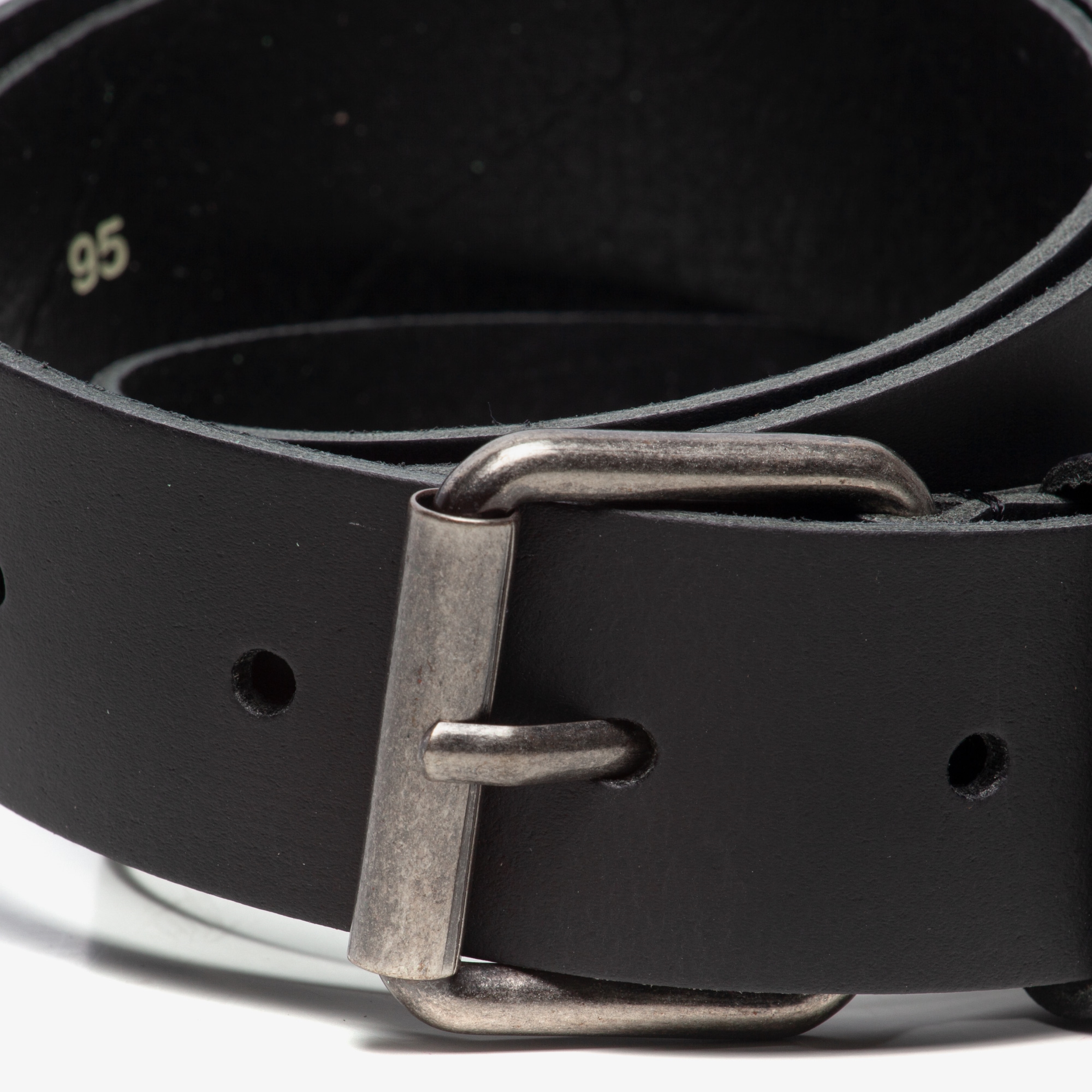 Zwarte leren riem voor heren. Voorzien van een zilverkleurige gesp. De hoogte van de riem is 37 milimeter. De riem is gemaakt van leer.