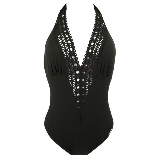 Zwart badpak Lise Charmel Ajourage Couture: halter, b-cup-triangel, ajour bij diepe V-hals/V-rug, niet gevoerd, perfecte snit! Shop online bij Italian Design!