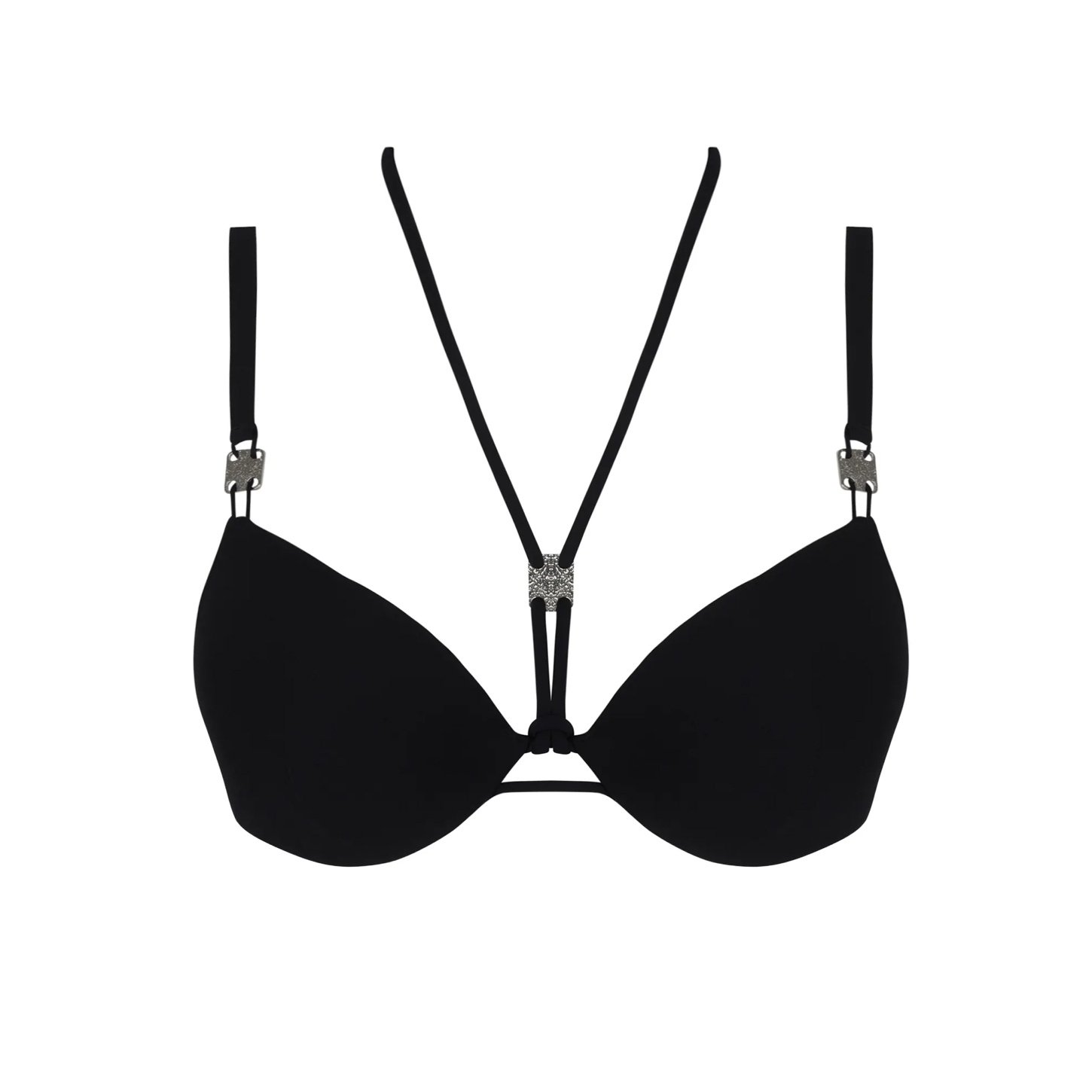 Voorgevormde bikinitop met beugels, diep decolleté en zilveren accenten. Sneldrogend en stijlvol met halter- of rechte bandjes.