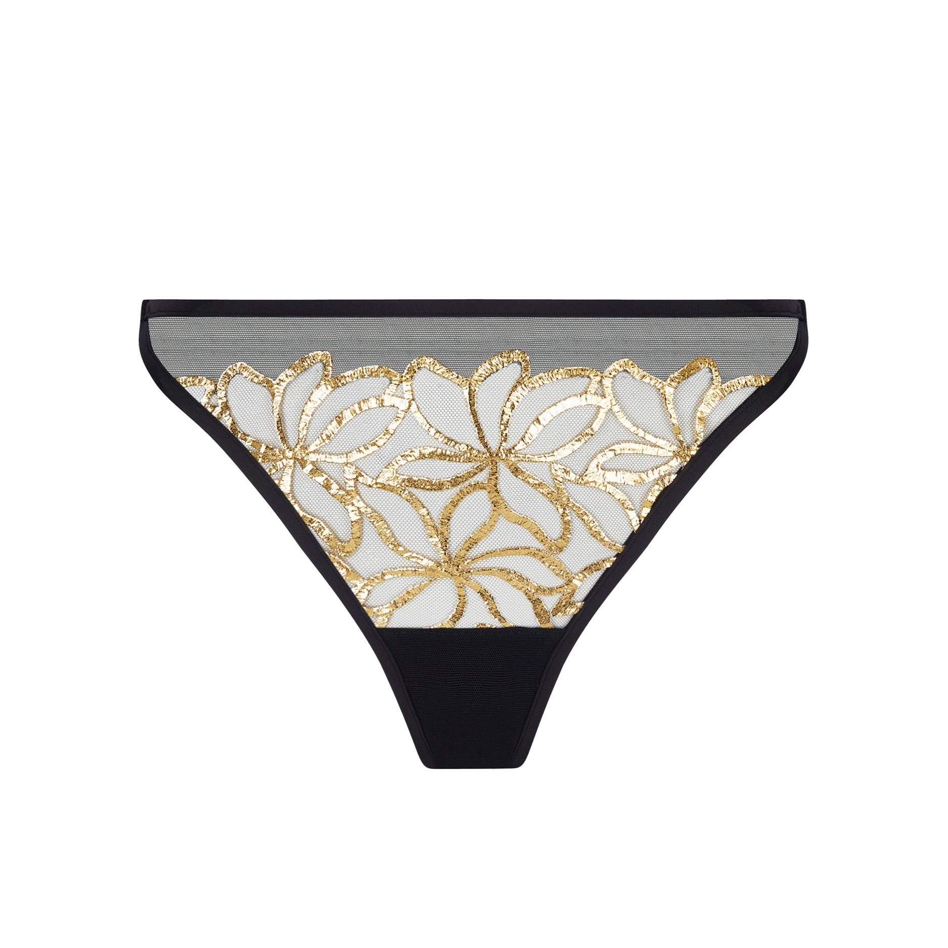 Ontdek de rijkdom van Lise Charmel lingerie Eclat d' Or Slip Seduction met prachtige goud gelamineerde bloemen op zwarte basis en schitter tijdens de feestdagen!