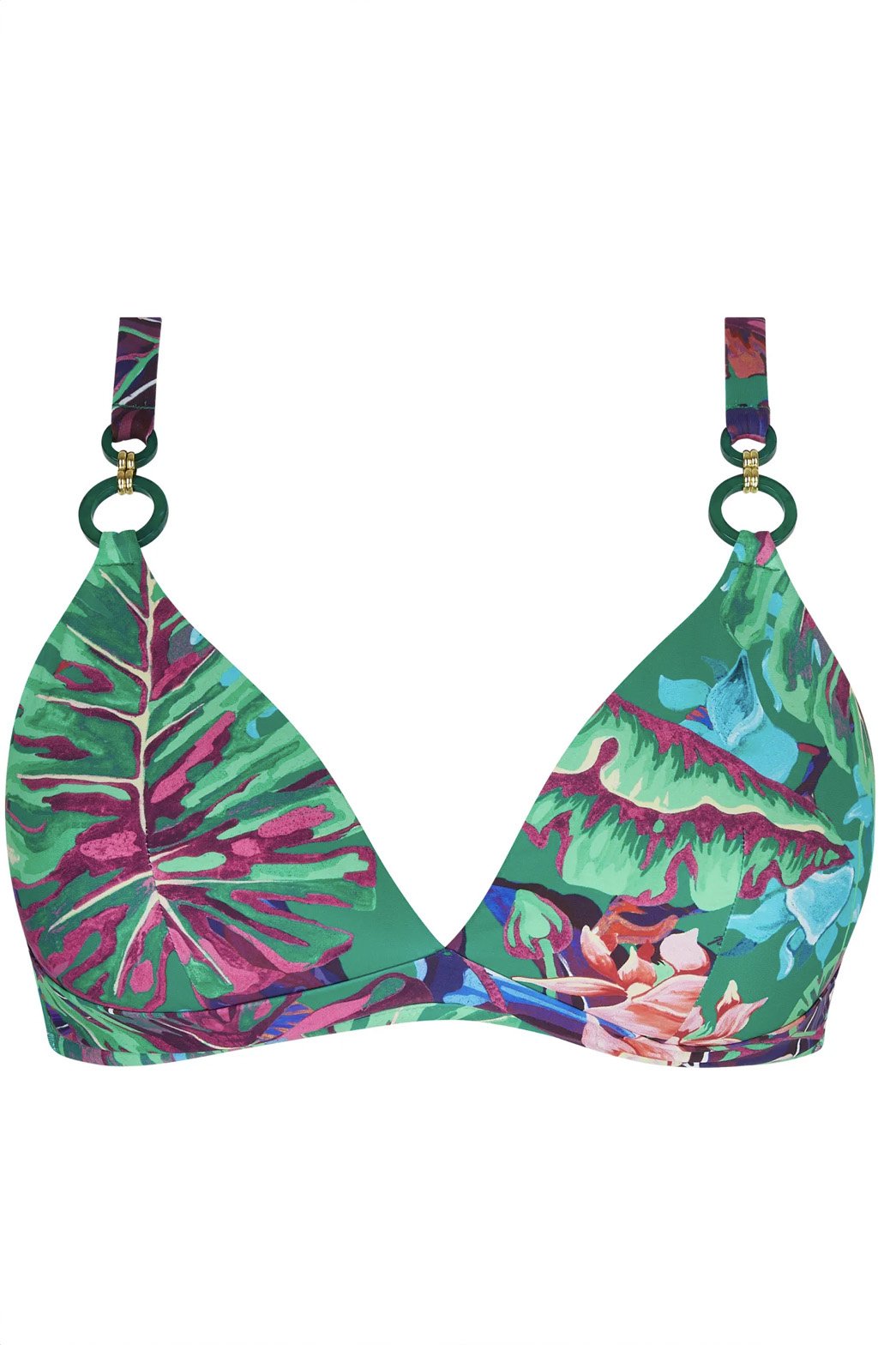 Lise Charmel Paradis Sauvage push-up bikinitop zonder beugel in rood, groen en paars bloemenmotief. Zomerse luxe, shop nu online!