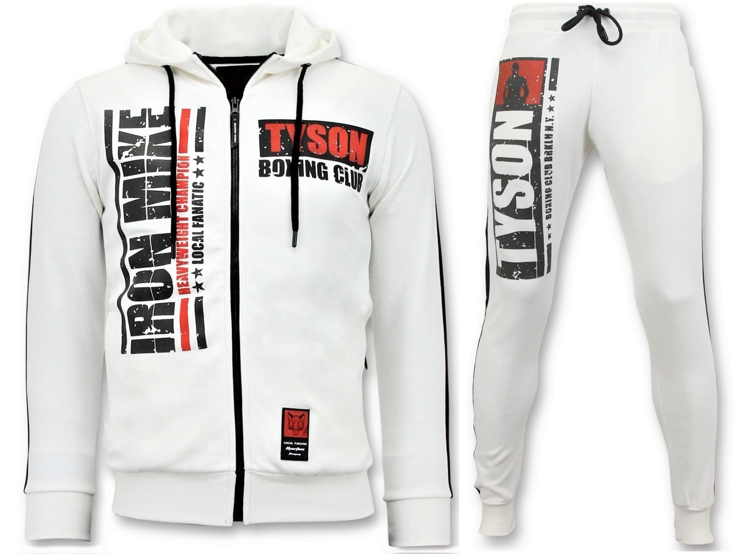 Exclusieve Heren Joggingpak – Iron Mike Tyson Boxing – Wit – Specificaties:- Exclusieve Heren Joggingpak,- Iron Mike Tyson Boxing- Kleur: Wit- Artikel code : 11-6244PW- Seizoen: Voorjaar / Najaar- Zakken Vest: 2 Steekzakken- Mouwen: Lange Mouw- Zakken broek: 2 Steekzakken- Kwalitatief Hoogwaardige Afwerking- Materiaal: 60% Katoen, 40% Polyester- Weefsel: Dun geweven- Pasvorm: Regular Fit- Pasvorm broek: Regular Fit- Wasvoorschrift: Machinewas 30 graden, Binnenste buiten wassen (Niet in de droger)- Beschikbare maten: XS – S – M – L – XL Local Fanaticis een jong merk voor modebewuste mannen die aandacht besteden aan kleding en uiterlijk met de Allure en Glamour. Kenmerkend van het merk zijn de zeefdruk- en digitaal prints die gegarandeerd staan voor kwaliteit van vooruitstrevende stoffen in Italiaanse pasvormen.