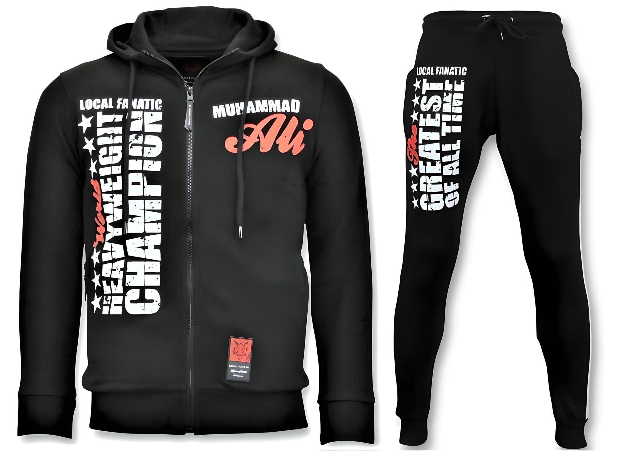 Exclusieve Heren Joggingpak- Muhammad Ali Sport Set – Zwart – Specificaties:- Exclusieve Heren Joggingpak – Muhammad Ali Champion Set- Kleur: Zwart- Artikel code : 11-6243PZ- Seizoen: Voorjaar / Najaar- Zakken Vest: 2 Steekzakken- Mouwen: Lange Mouw- Zakken broek: 2 Steekzakken- Kwalitatief Hoogwaardige Afwerking- Materiaal: 60% Katoen, 40% Polyester- Weefsel: Dun geweven- Pasvorm: Regular Fit- Pasvorm broek: Regular Fit- Wasvoorschrift: Machinewas 30 graden, Binnenste buiten wassen (Niet in de droger)- Beschikbare maten: XS – S – M – L – XL Local Fanaticis een jong merk voor modebewuste mannen die aandacht besteden aan kleding en uiterlijk met de Allure en Glamour. Kenmerkend van het merk zijn de zeefdruk- en digitaal prints die gegarandeerd staan voor kwaliteit van vooruitstrevende stoffen in Italiaanse