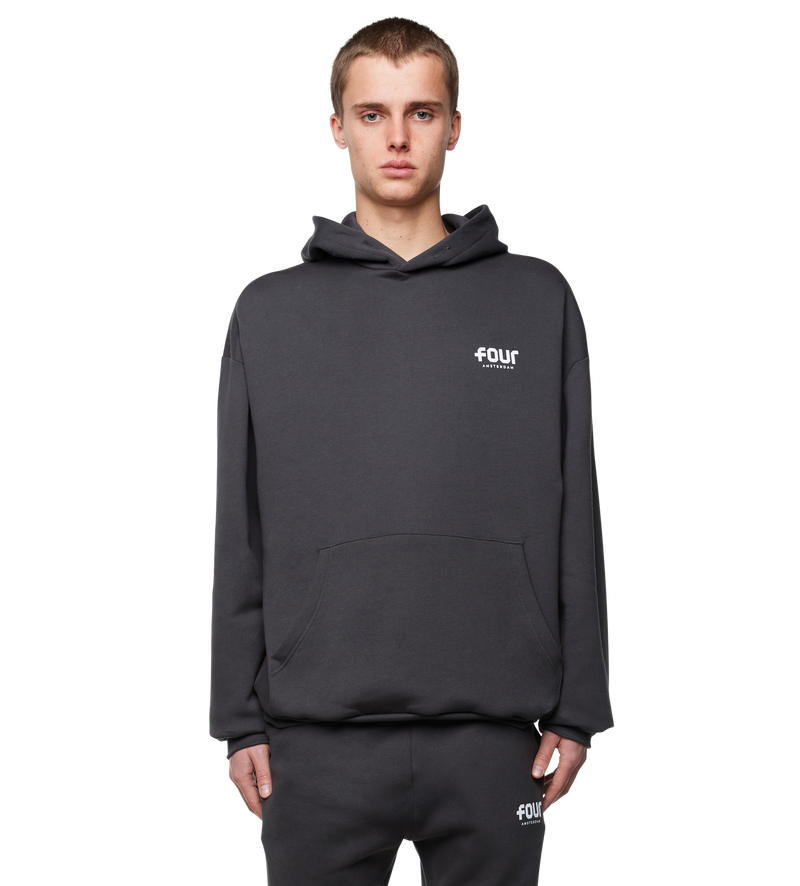 Logo Hoodie Asphalt by FOUR. 100% Cotton Classic hood Small logo on the chest 330gsm cotton fleece Kangaroo pocket on the front To ensure the perfect fit, we kindly refer to our size charts before making your selection. This is our classic, oversized fit, if you prefer a fitted silhouette, size down from your regular size.