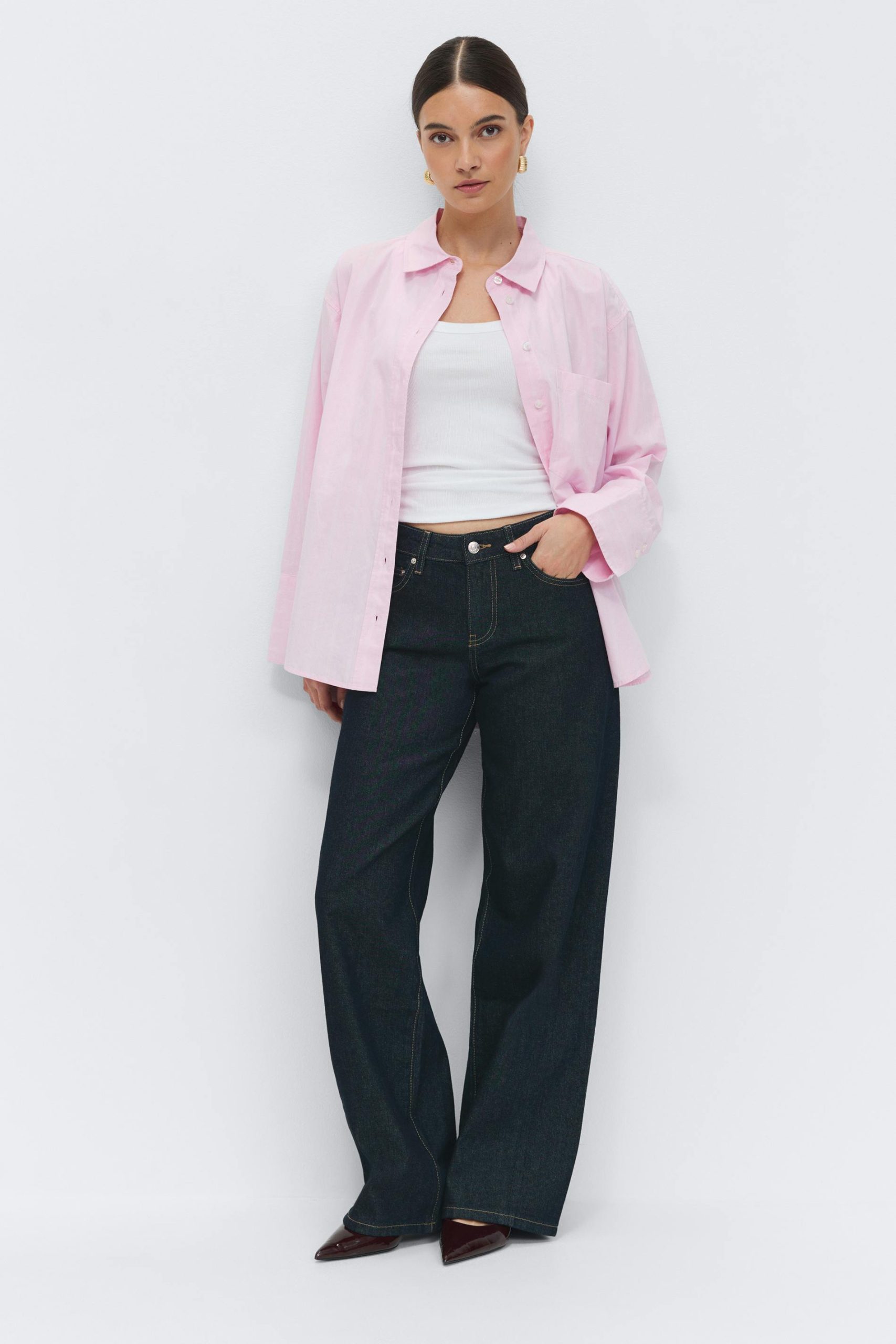 Jeans met brede pijpen met lage taille. De spijkerbroek is blauw en heeft gedraaide naden. Het heeft brede broekspijpen met volledige lengte, normale pasvorm, gulp, riemlussen en zakken aan de voor- en achterzijde. Rekvrij.