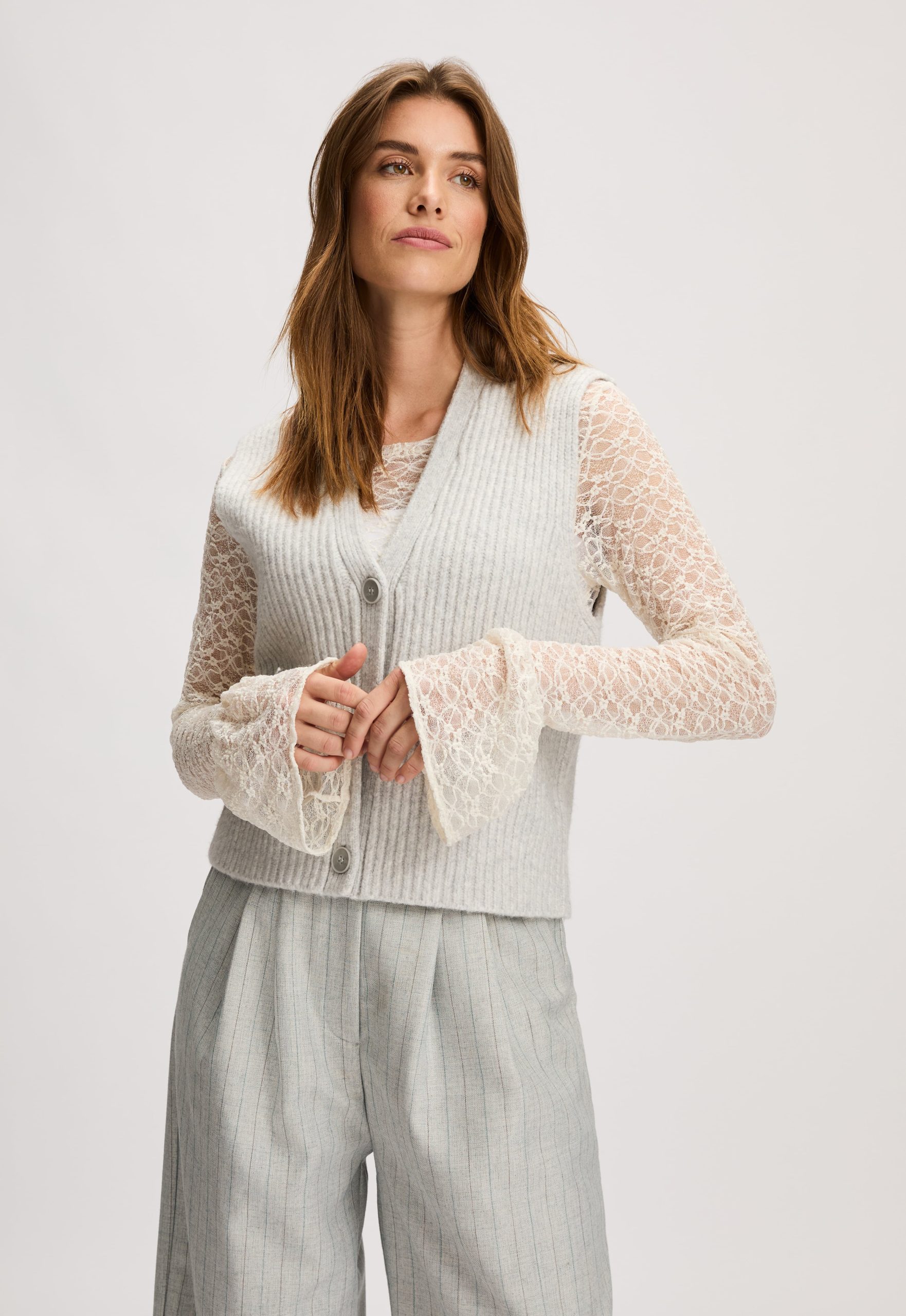 Dit is de Marjolaine Spencer van het merk Madness. Deze Spencer heeft een mouwloze pasvorm en is voorzien van een knoopsluiting.