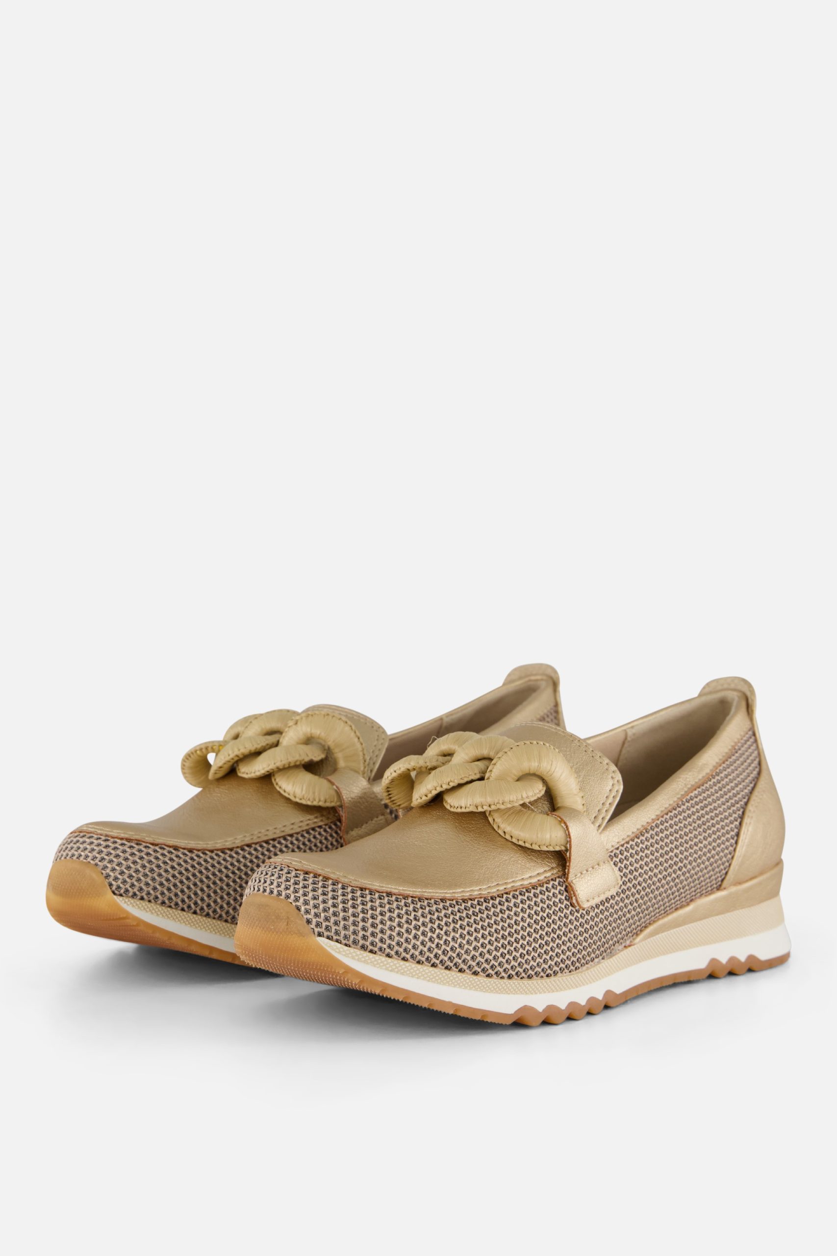 Deze metallic gouden Marco Tozzi instappers zijn gemaakt van textiel. De voering en comfortabele binnenzool zijn gemaakt van synthetisch materiaal. Voorzien van een comfort binnenzool en een decoratieve gesp.