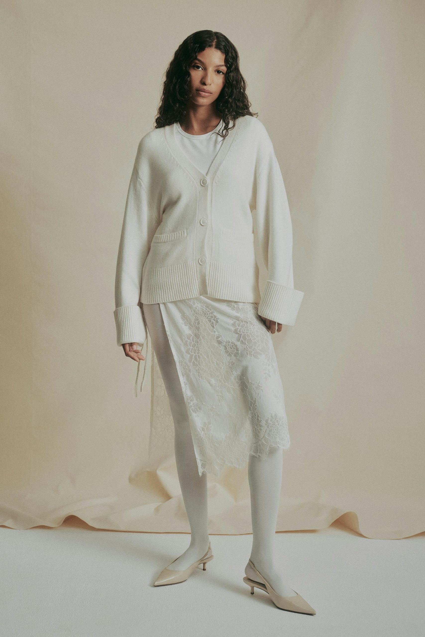 Gebreide cardigan van merino wol met zakken in de zijden. De cardigan is wit en heeft knoppen aan de voorkant. Het heeft v-hals, nauwsluitende pasvorm, lange mouwen en geribd gebreid materiaal aan de mouwuiteinden en aan de onderkant.