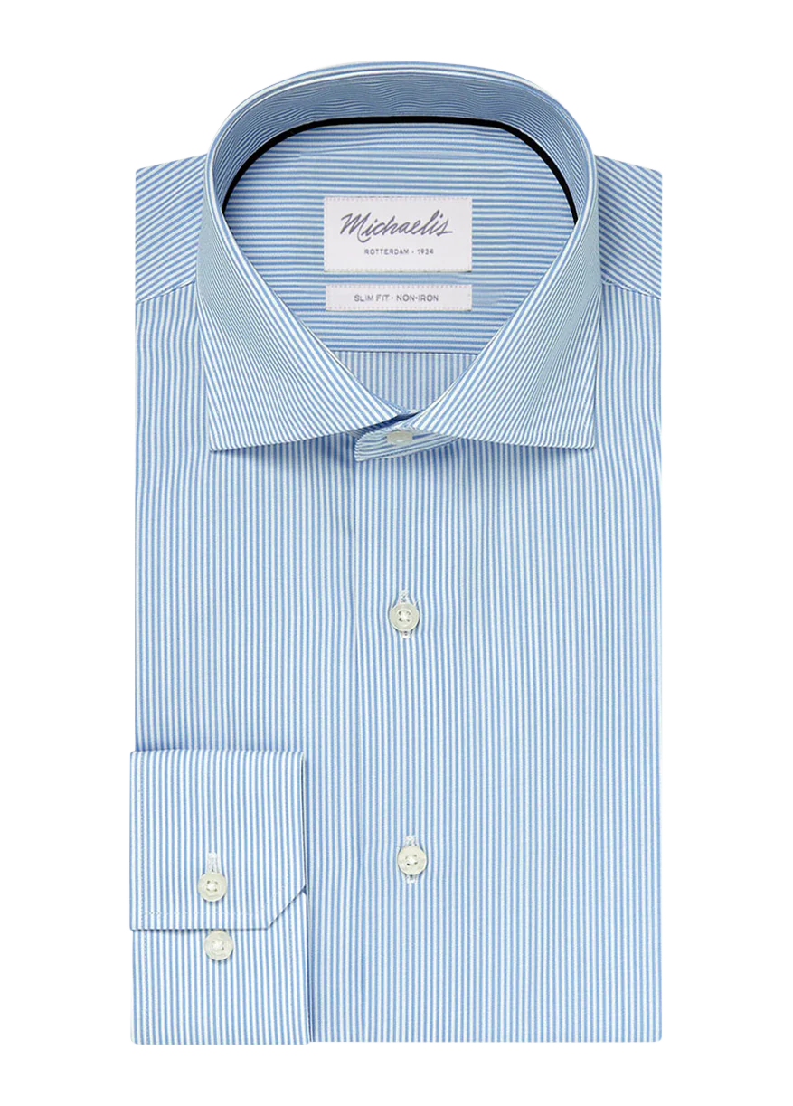 Een klassiek blauw wit streepje, een goed business overhemd van Michaelis. Het shirt hoef je dit shirt niet te strijken, want het is helemaal strijkvrij. Het Michaelis shirt heeft een fraai cut away boord en is mooi getailleerd. Getailleerde pasvorm 100% katoen Strijkvrij