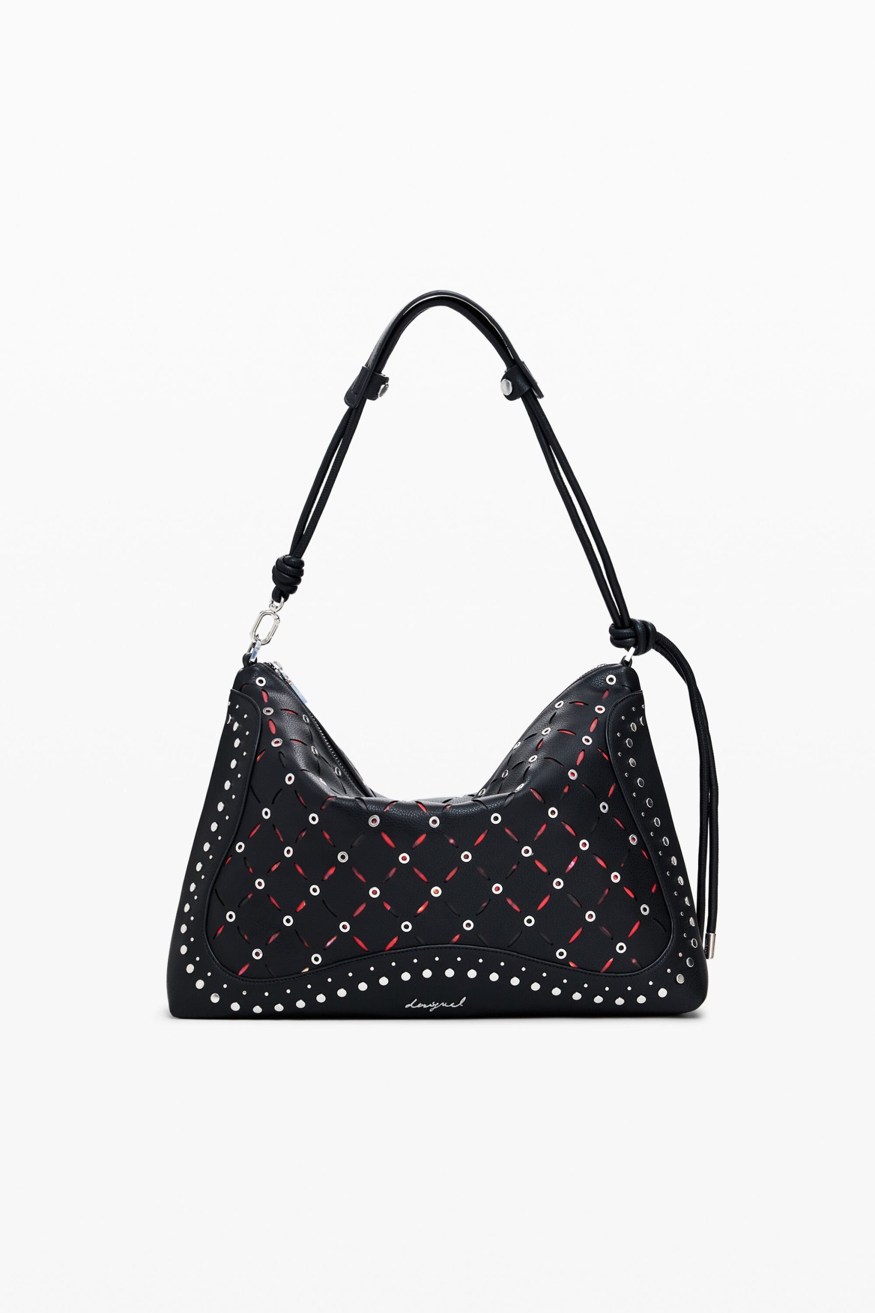 Schoudertas van gemiddelde grootte, in stof met leerlook, met perforaties, voering bedrukt met bloemmotieven en ritssluiting.