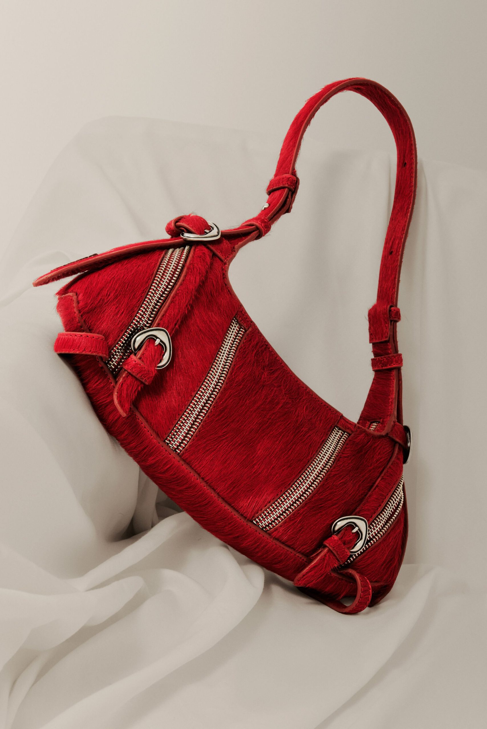 Middelgrote schoudertas gemaakt van leer met ritssluitingen, gespen, buitenzakken en een afwerking met haareffect.