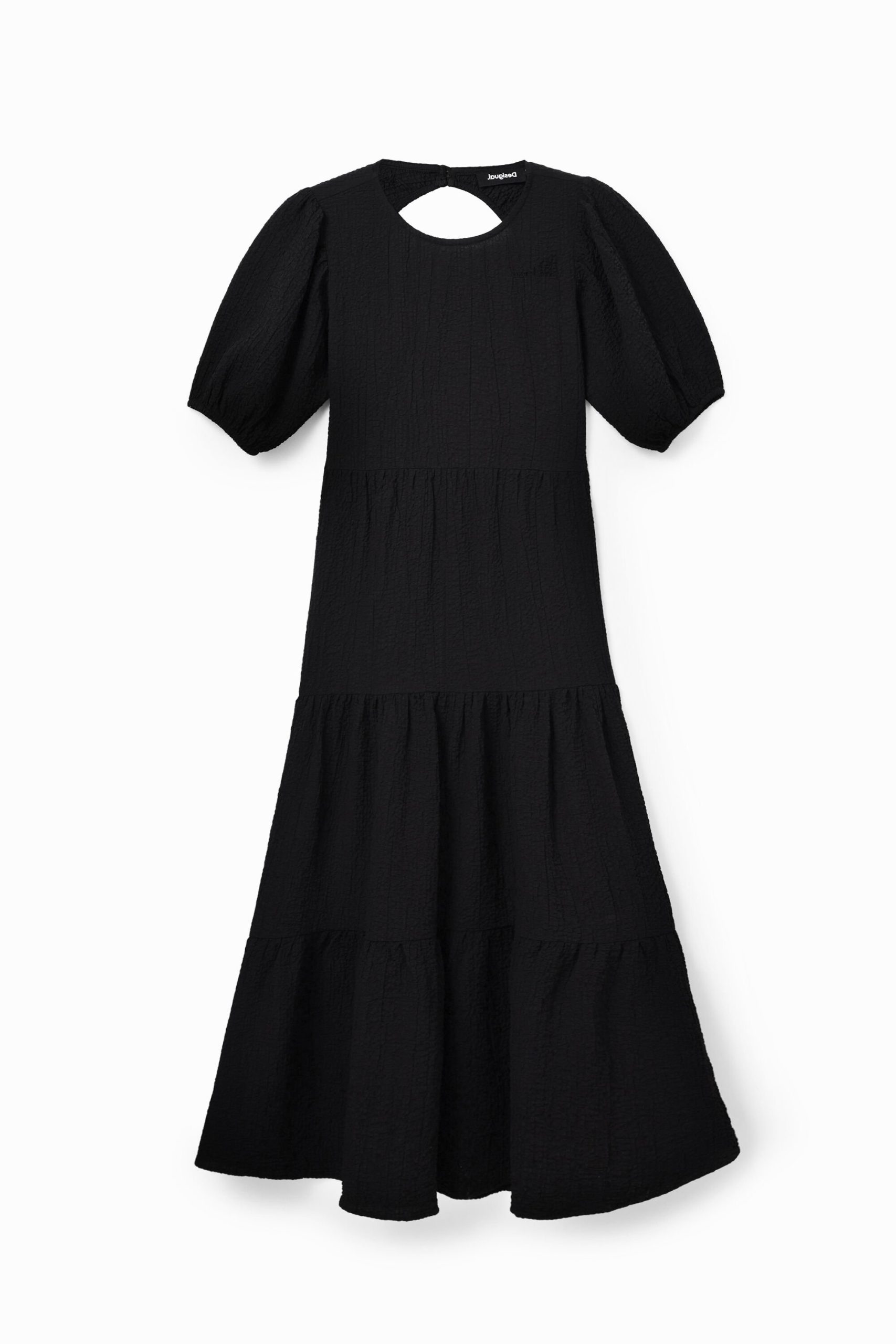 Midi-jurk met korte pofmouwen, een wijd rugdecolleté en structuurstof.